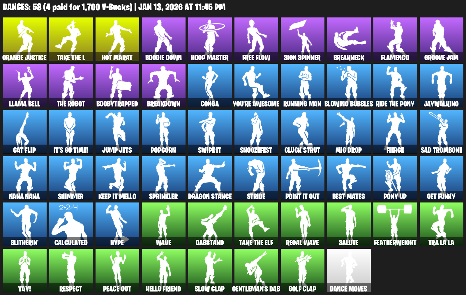 Hot Marat, Orange Justice, Boogie Down, Hoop Master, Free Flow, Sign Spinner, Breakneck, Flamenco, Groove Jam, Llama Bell, Boobytrapped, Breakdown, Conga, You’re Awesome, Running Man, Blowing Bubbles, Jaywalking