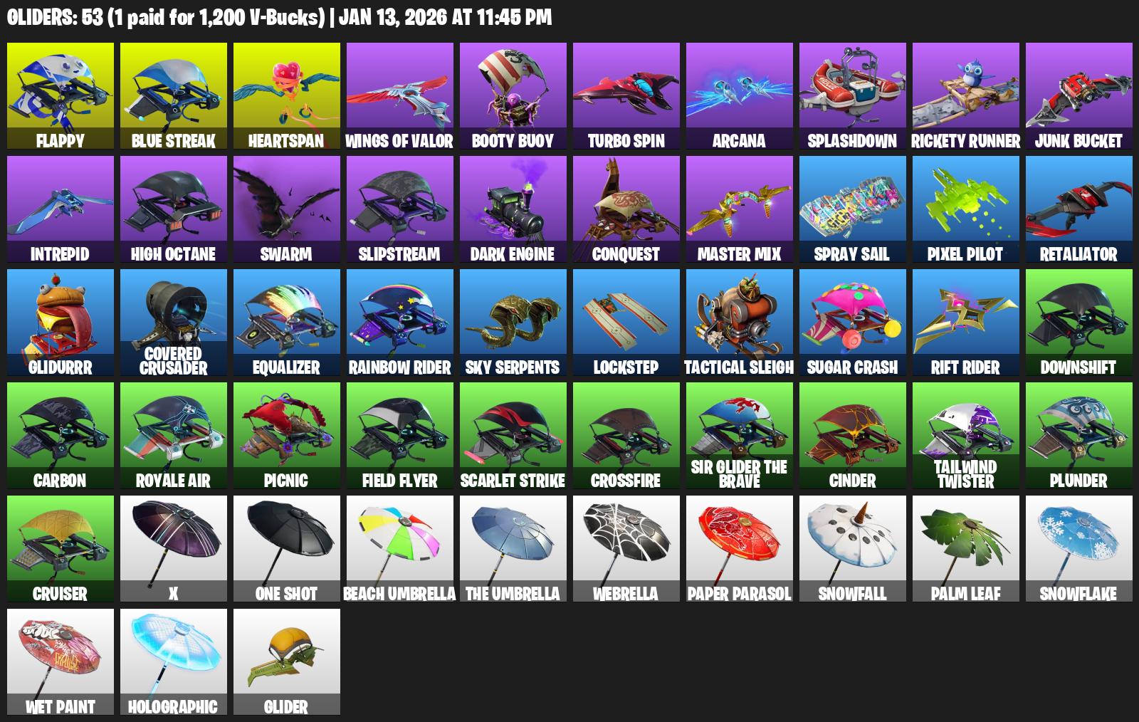 Flappy, Heartspan, Wings of Valor, Booty Buoy, Turbo Spin, Arcana, Splashdown, Rickety Runner, Junk Bucket, Intrepid, High Octane, Swarm, Slipstream, Conquest, Spray Sail, Pixel Pilot, Retaliator