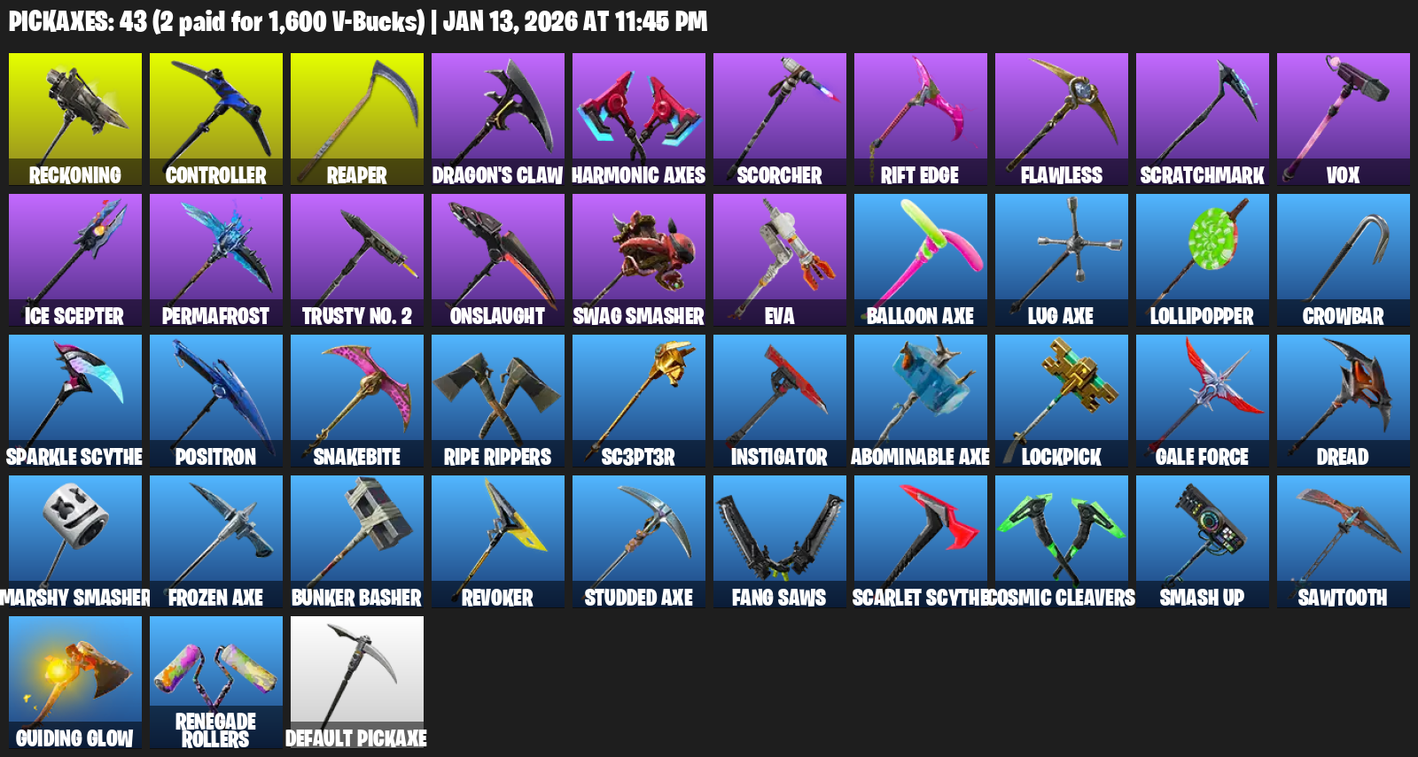 Reckoning, Controller, Dragon’s Claw, Harmonic Axes, Scorcher, Rift Edge, Flawless, Scratchmark, Vox, Ice Scepter, Permafrost, Trusty No. 2, Onslaught, Swag Smasher, EVA, Balloon Axe, Lollipopper, Crowbar