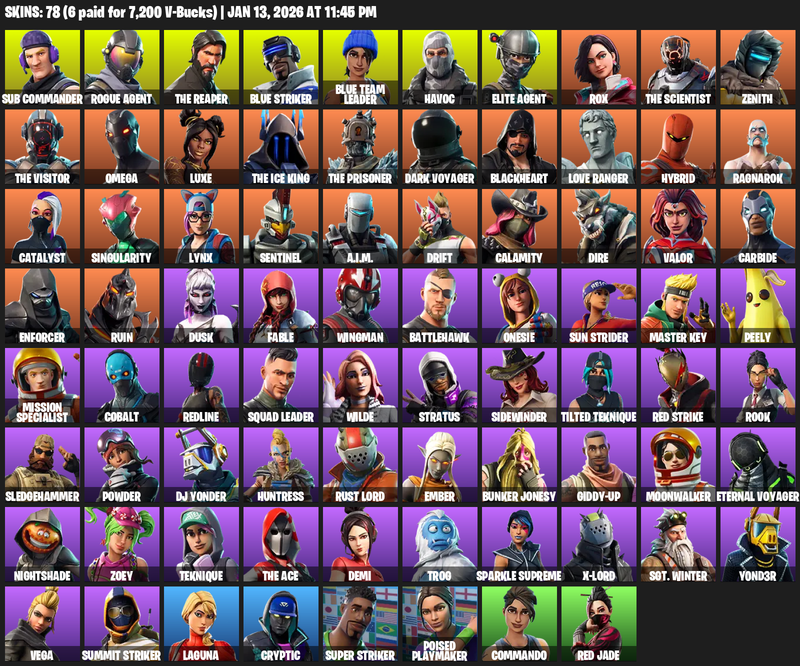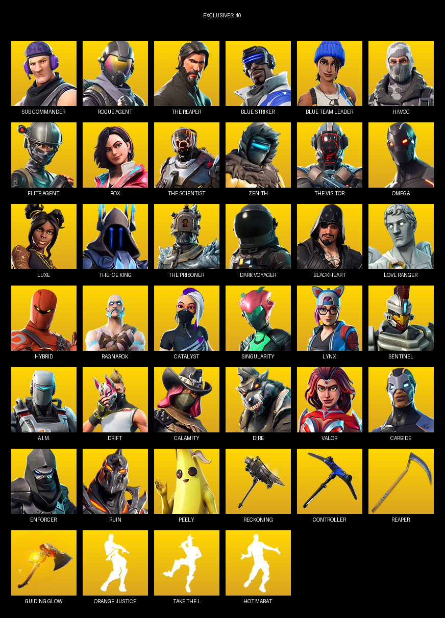 The Reaper, Elite Agent, Omega, Sub Commander, Blue Striker, Havoc, Rox, Zenith, Luxe, Dark Voyager, Blackheart, Love Ranger, Hybrid, Ragnarok