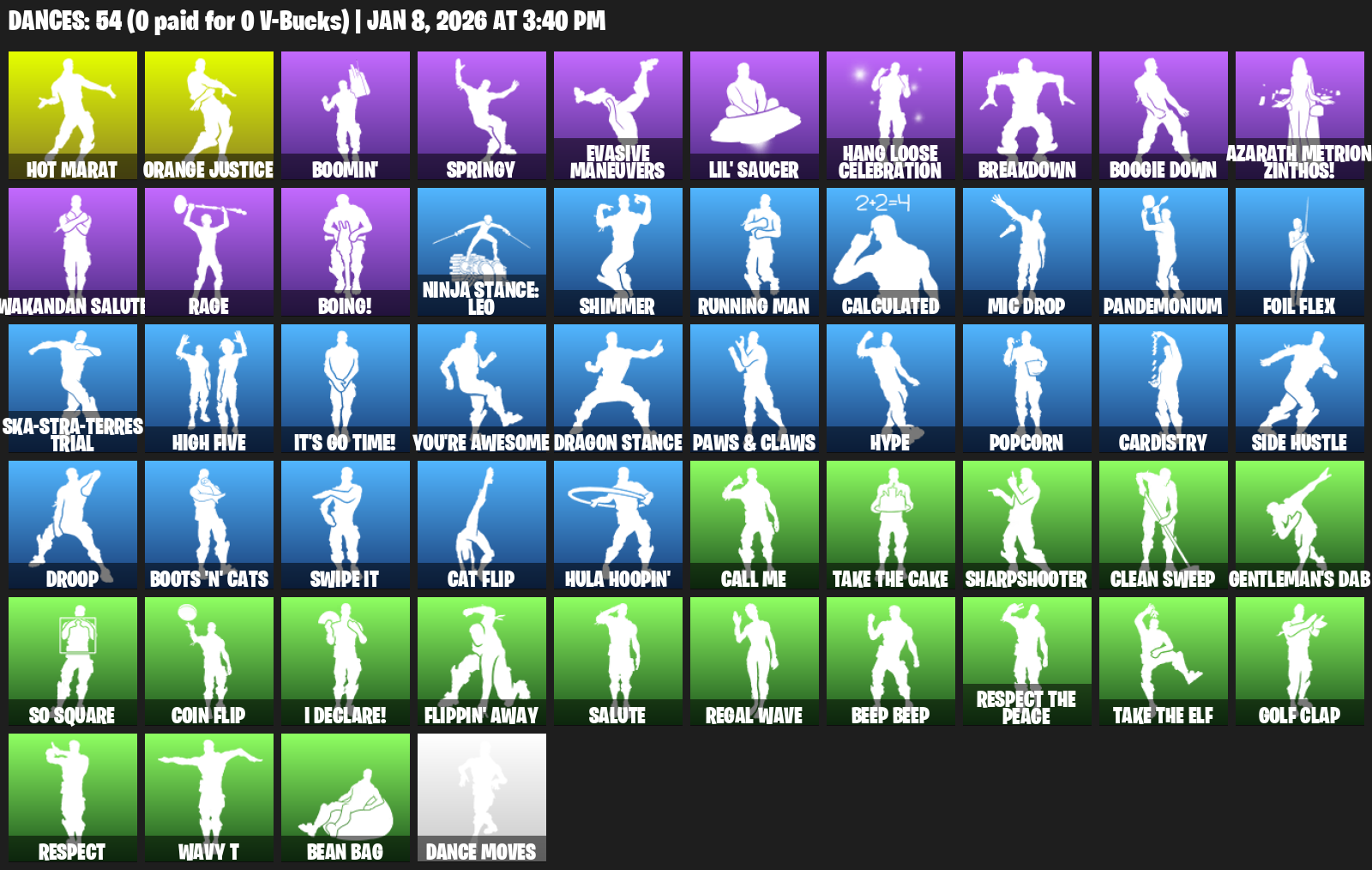 Hot Marat, Orange Justice, Boomin’, Springy, Evasive Maneuvers, Lil’ Saucer, Hang Loose Celebration, Breakdown, Boogie Down, Azarath Metrion Zinthos!, Wakandan Salute, Rage, Boing!, Ninja Stance: Leo, Shimmer, Running Man, Calculated, Mic Drop, Pandemonium, Foil Flex