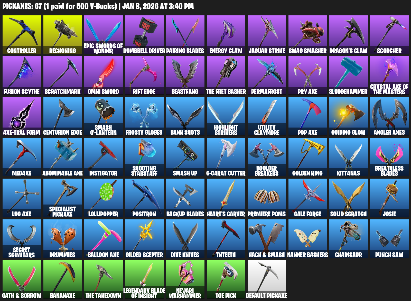 Controller, Reckoning, Dumbbell Driver, Pairing Blades, Energy Claw, Jaguar Strike, Swag Smasher, Scorcher, Scratchmark, Omni Sword, Rift Edge, Beastfang, The Fret Basher, Permafrost, Pry Axe, Sludgehammer