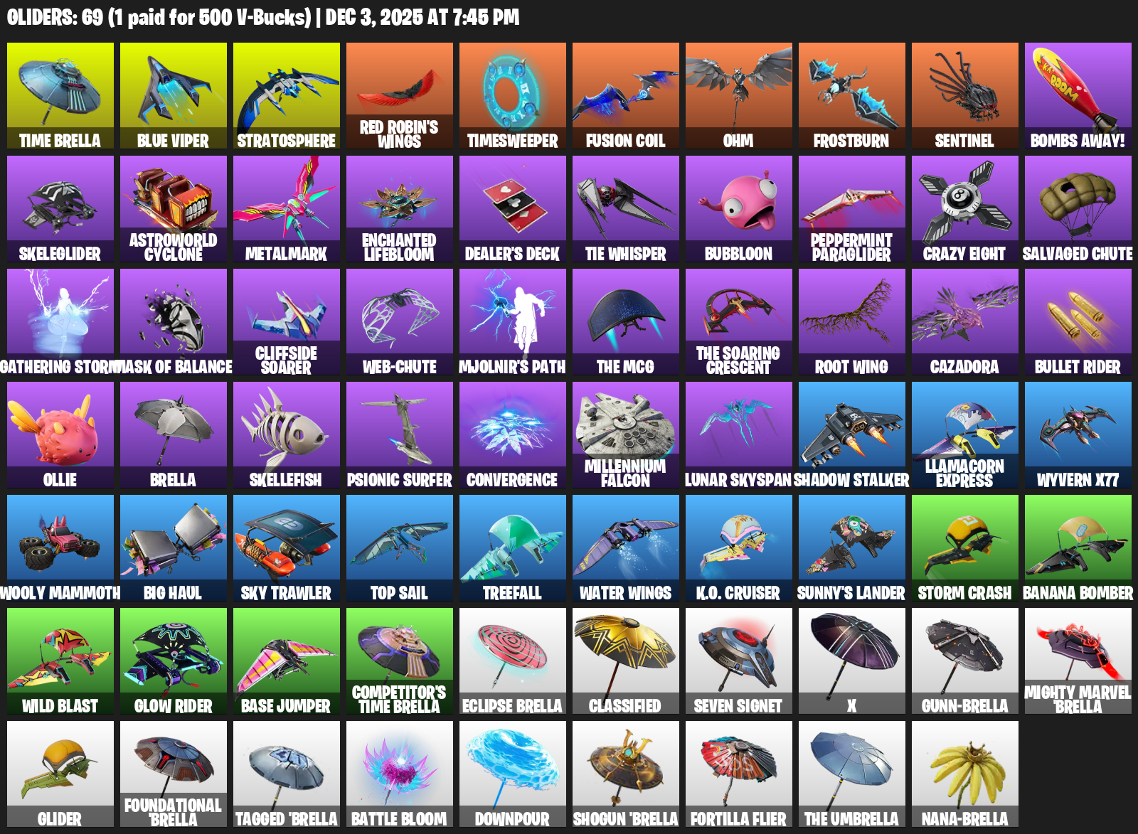Time Brella, Blue Viper, Stratosphere, Timesweeper, Ohm, Frostburn, Sentinel, Bombs Away!, Skeleglider, Astroworld Cyclone, Metalmark, Enchanted Lifebloom, Dealer’s Deck, TIE Whisper, Bubbloon, Peppermint Paraglider, Crazy Eight, Salvaged Chute