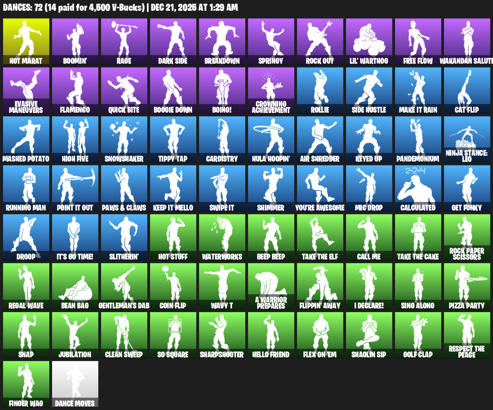 Hot Marat, Boomin’, Rage, Dark Side, Breakdown, Springy, Rock Out, Lil’ Warthog, Free Flow, Wakandan Salute, Evasive Maneuvers, Flamenco, Quick Bite, Boogie Down, Boing!, Crowning Achievement, Rollie, Make It Rain, Cat Flip