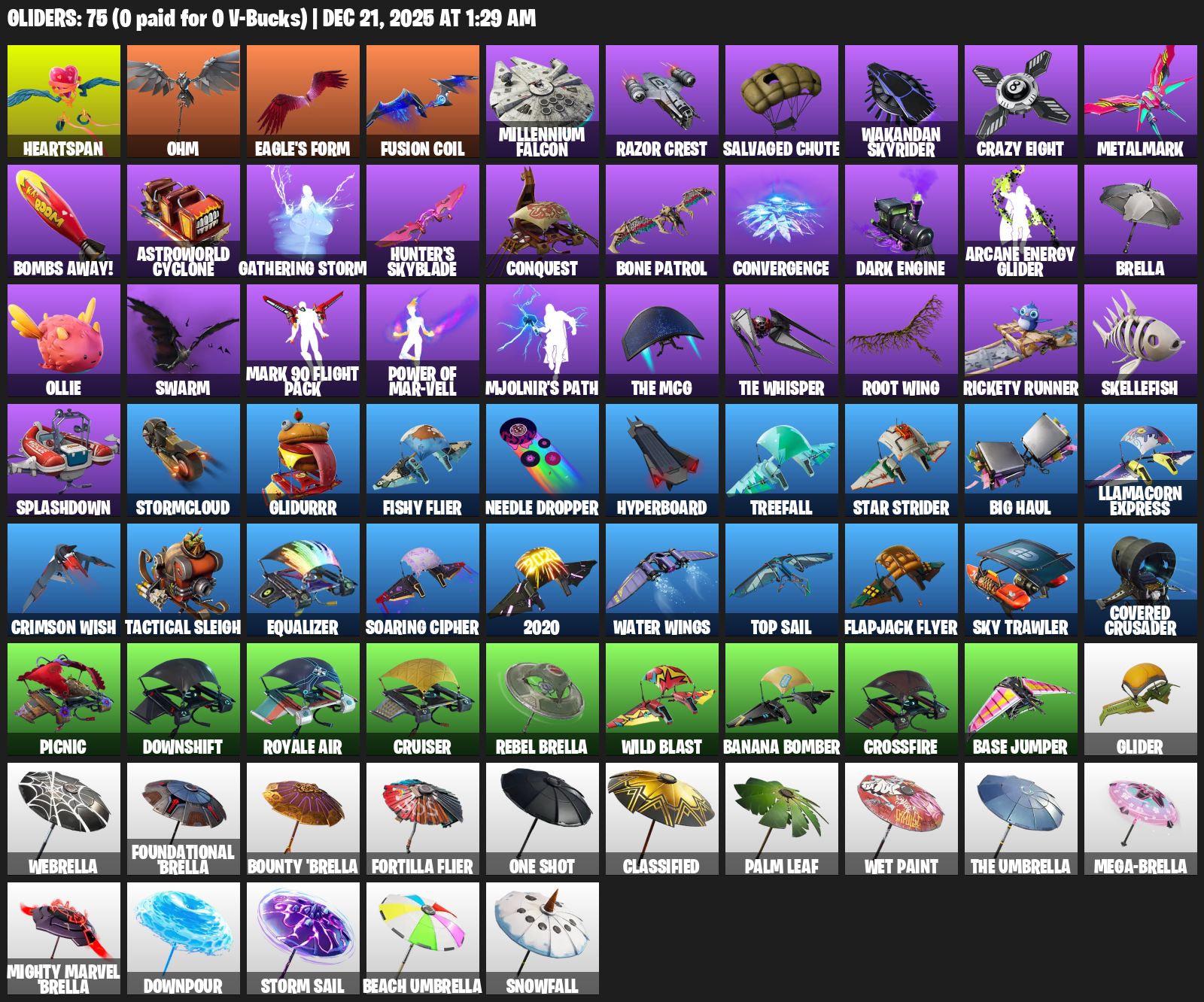 Heartspan, Ohm, Eagle’s Form, Millennium Falcon, Razor Crest, Salvaged Chute, Crazy Eight, Metalmark, Bombs Away!, Astroworld Cyclone, Gathering Storm, Hunter’s Skyblade, Conquest, Bone Patrol, Convergence, Arcane Energy Glider, Brella