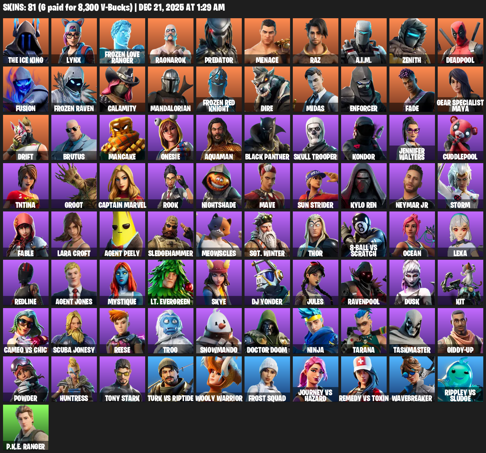 [PC/XBOX] | 81 skins | Lara Croft | The Ice King | Lynx | Frozen Love Ranger | Ragnarok | Predator | Menace | Raz | A.I.M. | Zenith | #TJP7820