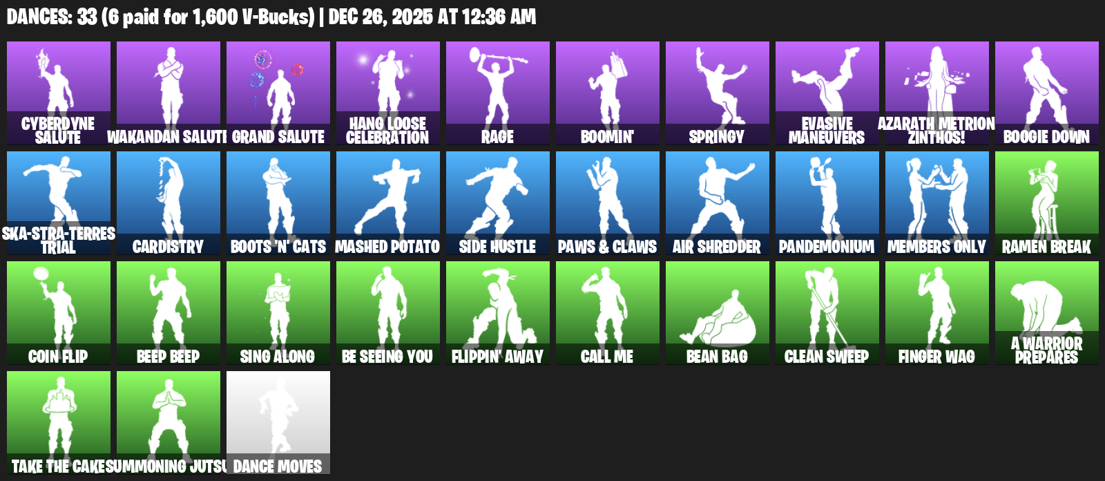 Cyberdyne Salute, Hang Loose Celebration, Rage, Boomin’, Springy, Evasive Maneuvers, Azarath Metrion Zinthos!, Boogie Down, Ska-stra-terrestrial, Cardistry, Boots ‘n’ Cats, Mashed Potato, Side Hustle, Paws & Claws, Air Shredder, Pandemonium, Members Only, Ramen Break