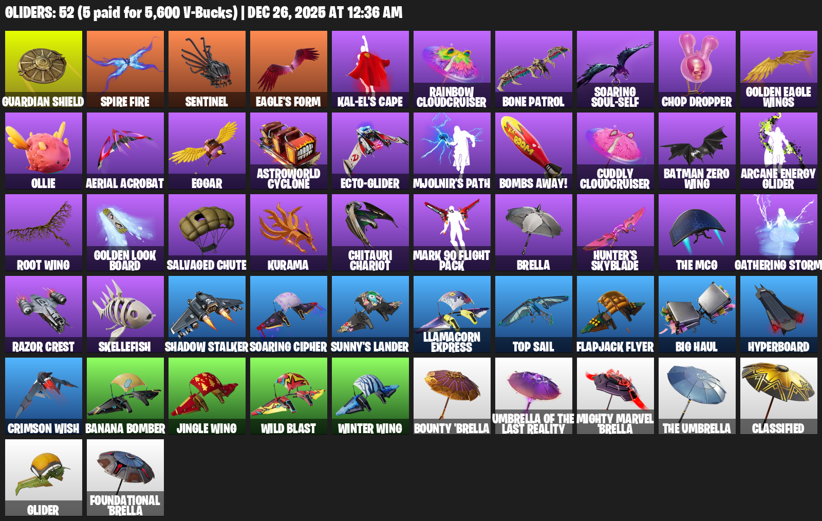 Guardian Shield, Spire Fire, Sentinel, Eagle’s Form, Kal-El’s Cape, Rainbow Cloudcruiser, Bone Patrol, Soaring Soul-Self, Chop Dropper, Golden Eagle Wings, Ollie, Aerial Acrobat, Eggar, Astroworld Cyclone, Ecto-Glider, Mjolnir’s Path, Bombs Away!, Batman Zero Wing