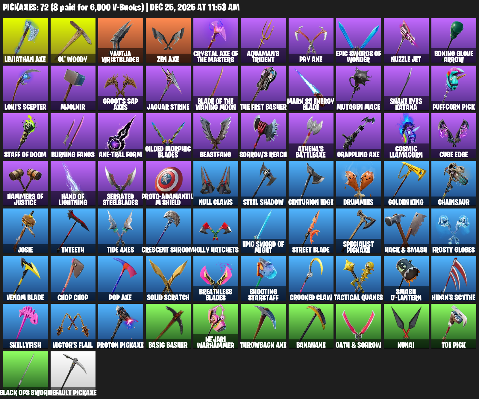Leviathan Axe, Ol’ Woody, Yautja Wristblades, Aquaman’s Trident, Nuzzle Jet, Boxing Glove Arrow, Loki’s Scepter, Mjolnir, Groot’s Sap Axes, Jaguar Strike, Blade of the Waning Moon, Mutagen Mace, Snake Eyes Katana, Puffcorn Pick