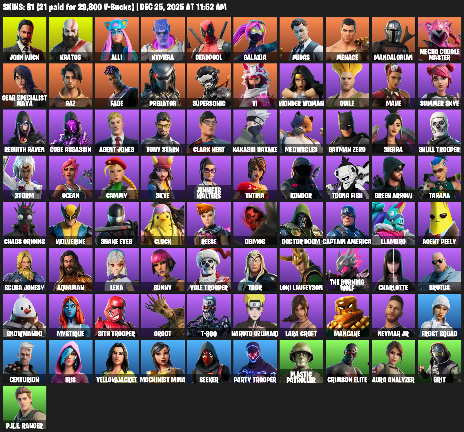 [PC/XBOX] | 81 skins | Leviathan Axe | Lara Croft | John Wick | Kratos | Alli | Kymera | Deadpool | Galaxia | Midas | Menace | Mandalorian | #BBA7293