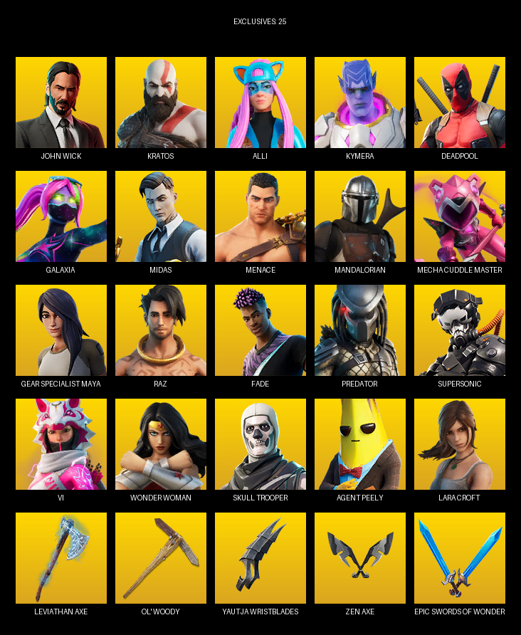 Gear Specialist Maya, Lara Croft, John Wick, Kratos, Alli, Kymera, Deadpool, Galaxia, Midas, Menace, Mandalorian, Mecha Cuddle Master, Raz, Fade, Predator, Supersonic, Vi, Wonder Woman, Guile, Mave