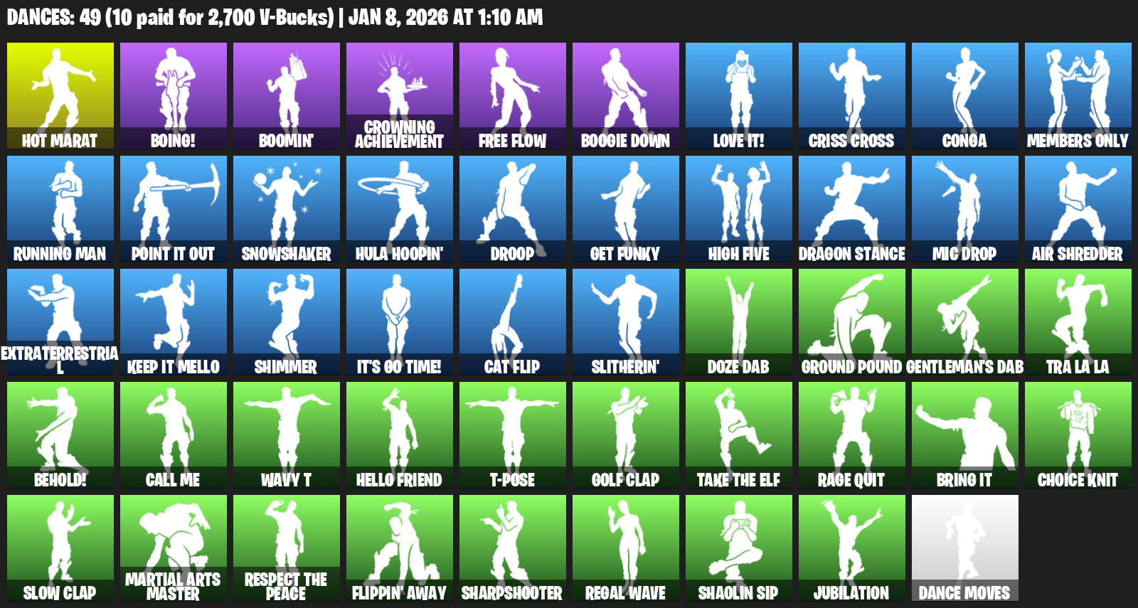 Hot Marat, Boing!, Boomin’, Crowning Achievement, Free Flow, Boogie Down, Criss Cross, Conga, Members Only, Running Man, Point It Out, Snowshaker, Hula Hoopin’, Droop, Get Funky, High Five, Dragon Stance, Mic Drop, Air Shredder