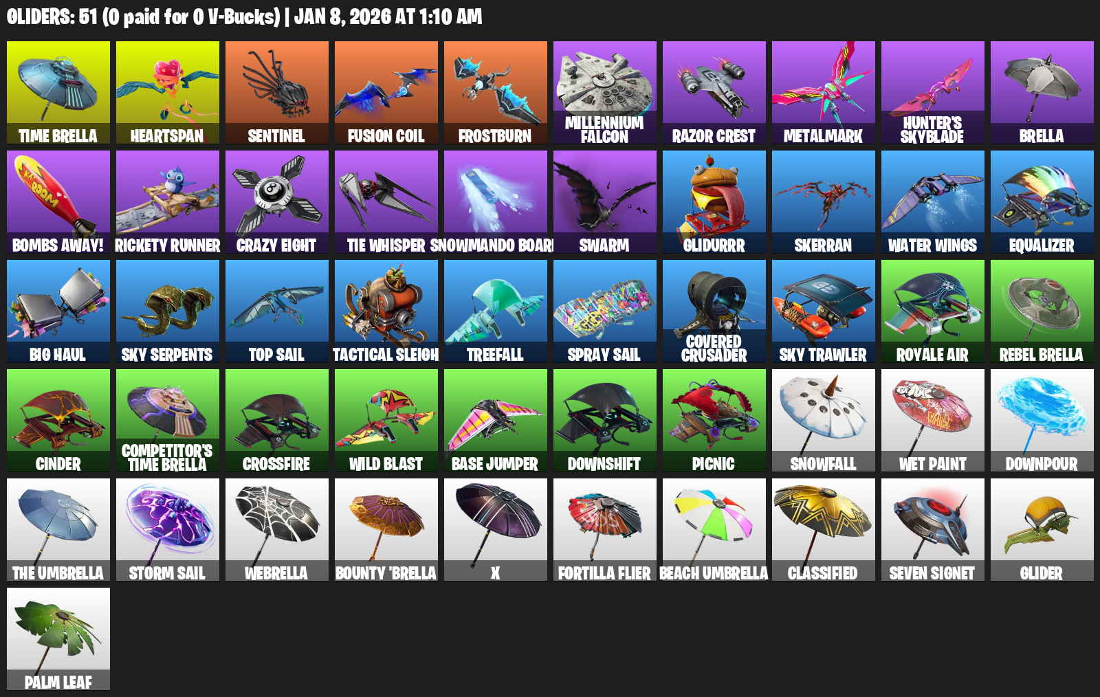 Time Brella, Heartspan, Sentinel, Frostburn, Millennium Falcon, Razor Crest, Metalmark, Hunter’s Skyblade, Bombs Away!, Rickety Runner, Crazy Eight, TIE Whisper, Snowmando Board, Swarm, Glidurrr, Skerran, Water Wings, Equalizer
