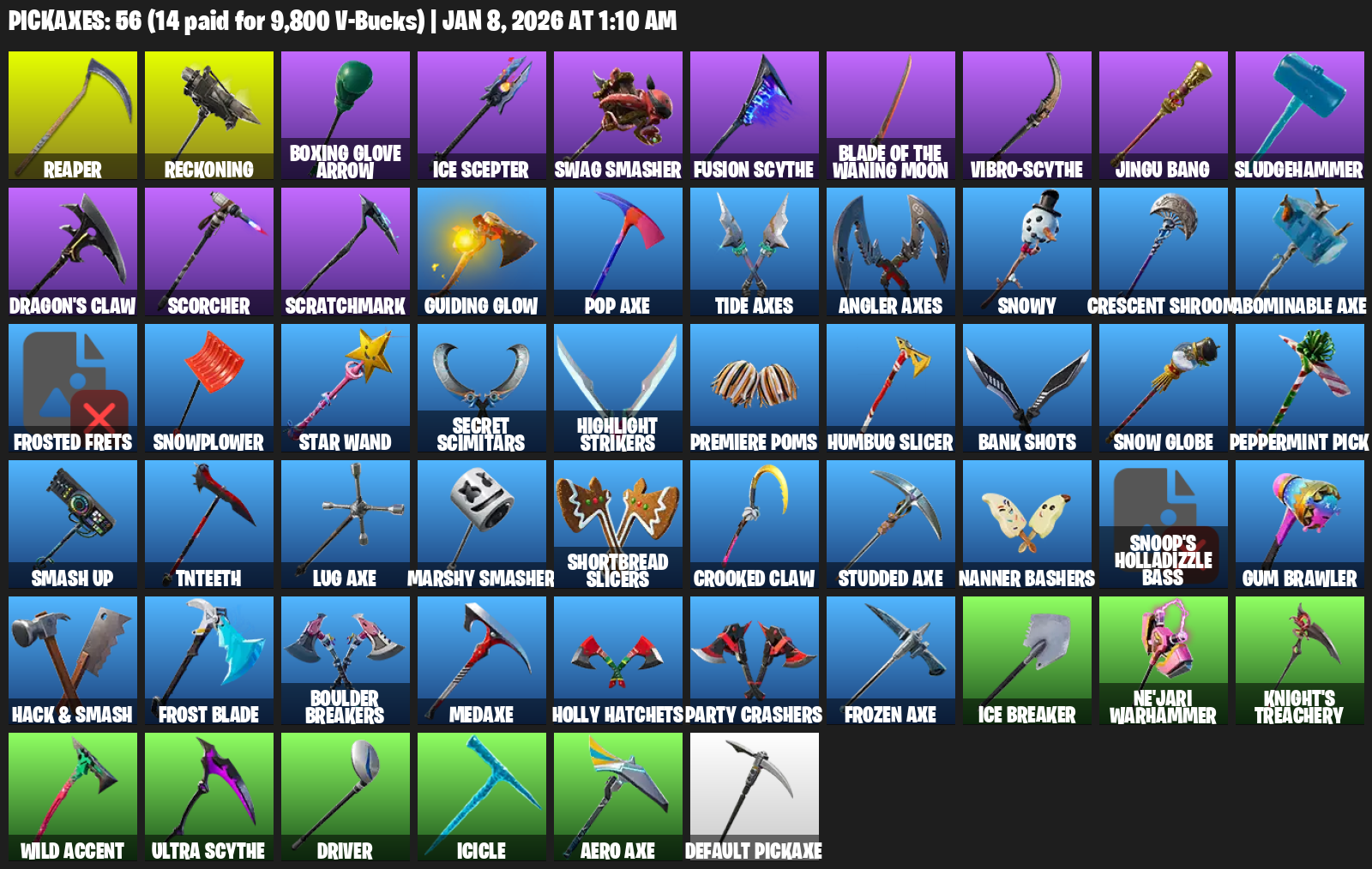 Reaper, Reckoning, Boxing Glove Arrow, Swag Smasher, Vibro-scythe, Jingu Bang, Sludgehammer, Dragon’s Claw, Scorcher, Scratchmark, Guiding Glow, Pop Axe, Tide Axes, Snowy, Crescent Shroom