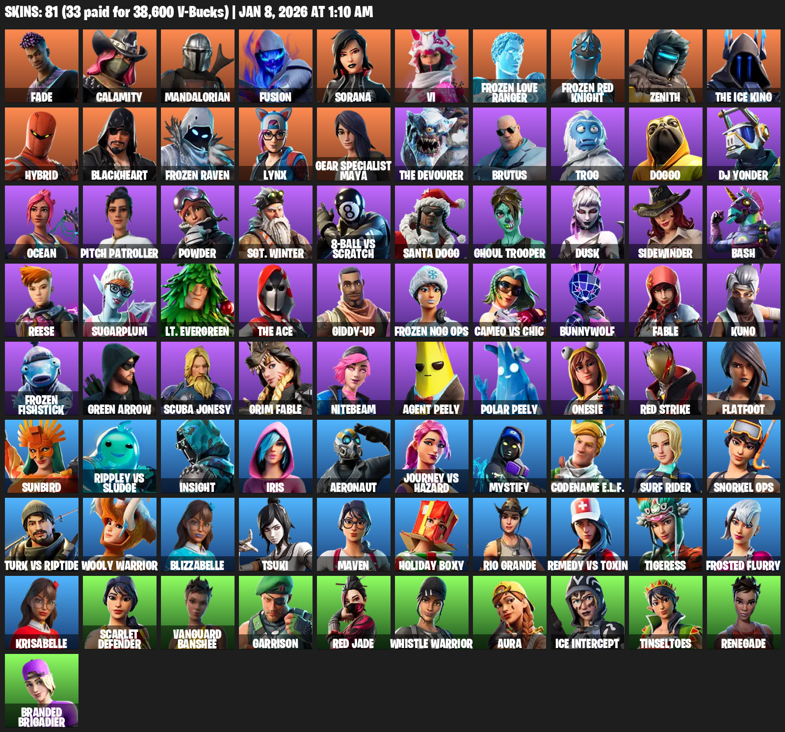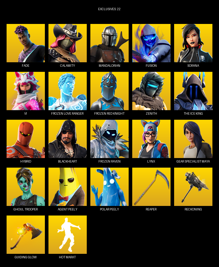 Gear Specialist Maya, Fade, Calamity, Mandalorian, Fusion, Sorana, Vi, Frozen Love Ranger, Zenith, The Ice King, Hybrid, Blackheart, Lynx, Brutus, Trog, Doggo, DJ Yonder