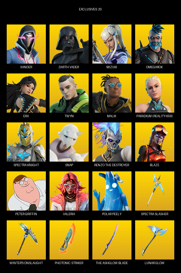 Xander, Darth Vader, Mizuki, Omegarok, Era, Twyn, Malik, Paradigm (Reality-659), Spectra Knight, Snap, Renzo the Destroyer, Blaze, Peter Griffin, Valeria, Loveless, Trace, Imani, Renegade Lynx, Doom Slayer, Hope