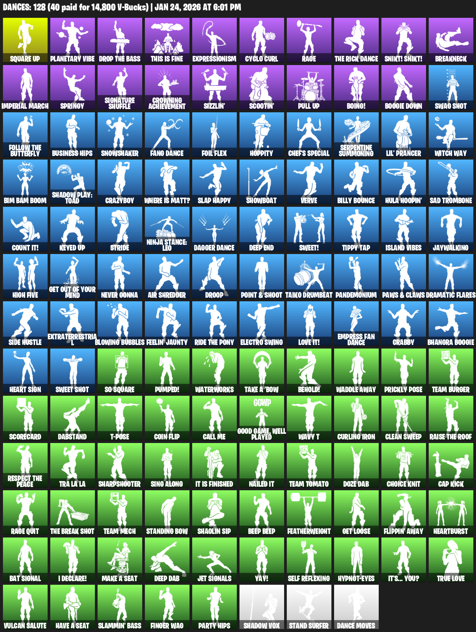 Square Up, Planetary Vibe, This is Fine, Expressionism, Cyclo Curl, Rage, Snikt! Snikt!, Breakneck, Imperial March, Springy, Signature Shuffle, Crowning Achievement, Sizzlin’, Scootin’, Boing!, Boogie Down, Swag Shot
