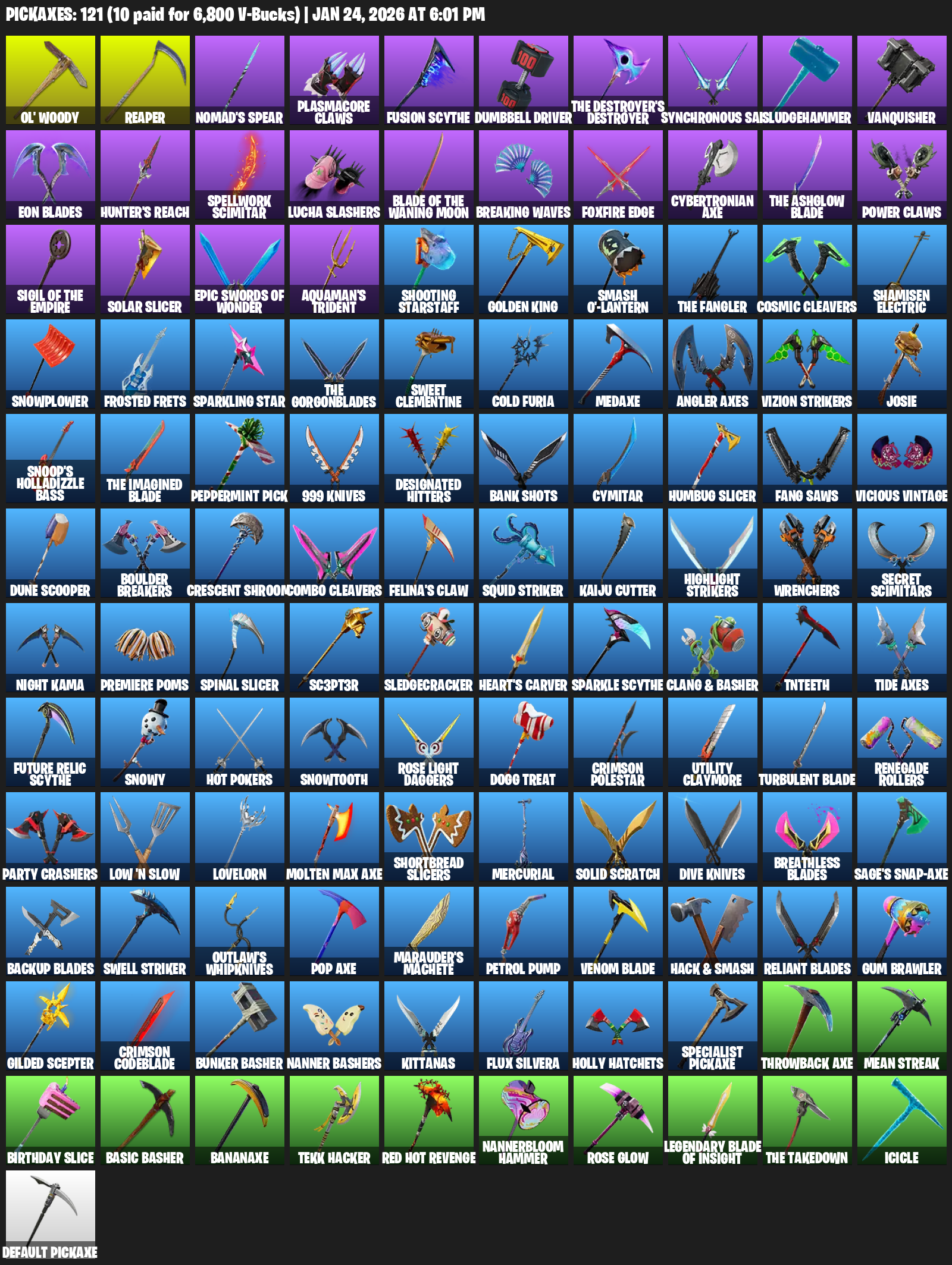 Ol’ Woody, Reaper, Nomad’s Spear, Plasmacore Claws, Dumbbell Driver, Synchronous Sai, Sludgehammer, Vanquisher, Eon Blades, Hunter’s Reach, Spellwork Scimitar, Lucha Slashers, Breaking Waves, Foxfire Edge, Cybertronian Axe