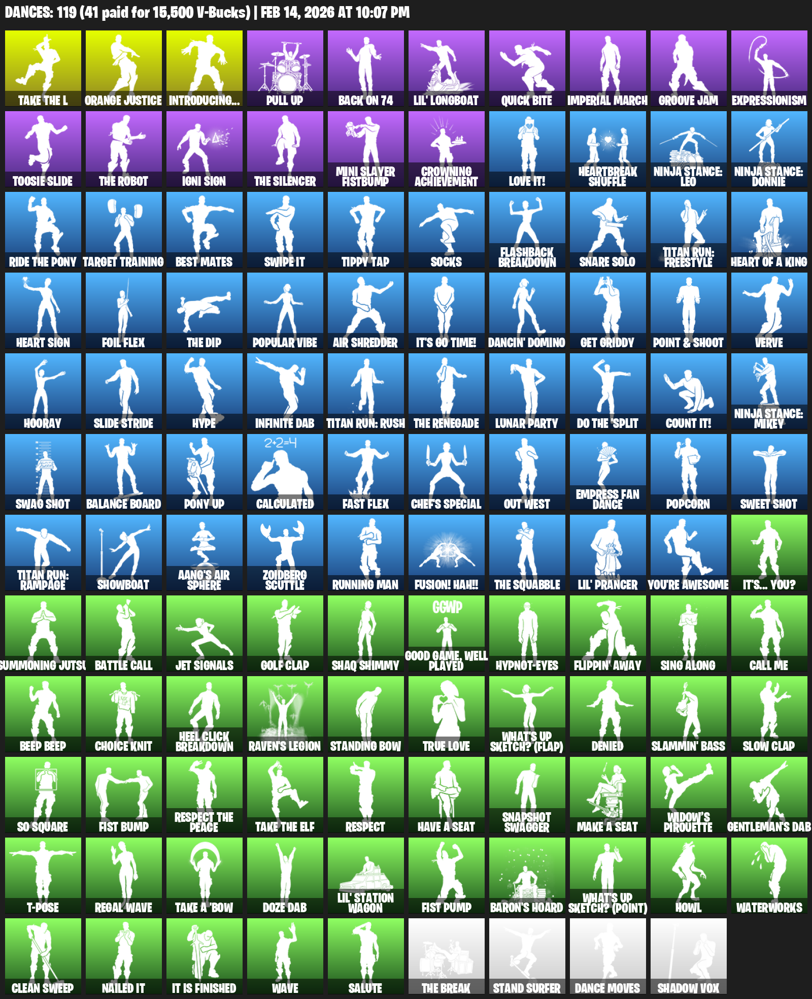 Introducing…, Orange Justice, Pull Up, Back On 74, Lil’ Longboat, Imperial March, Groove Jam, Expressionism, Toosie Slide, Igni Sign, Mini Slayer Fistbump, Crowning Achievement, Heartbreak Shuffle, Ninja Stance: Leo