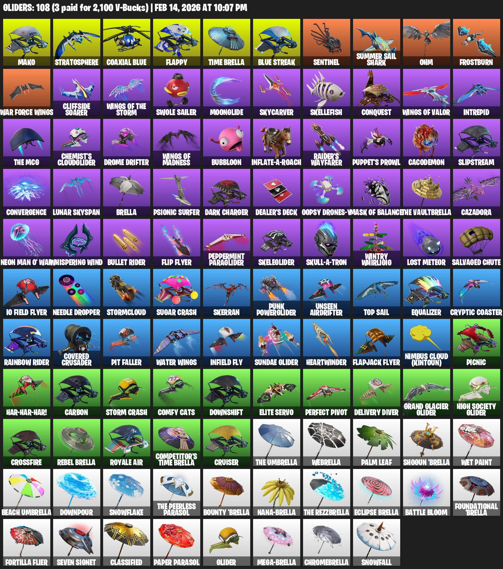 Mako, Stratosphere, Flappy, Time Brella, Sentinel, Summer Sail Shark, Ohm, Frostburn, War Force Wings, Cliffside Soarer, Swole Sailer, Moonglide, Skycarver, Skellefish, Conquest, Intrepid