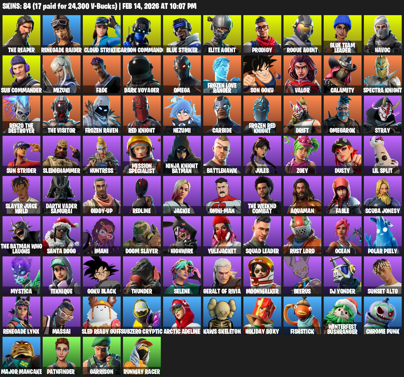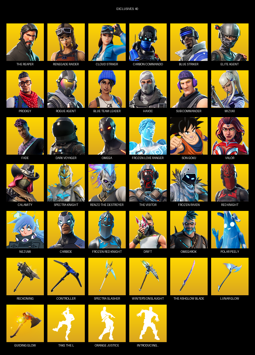 The Reaper, Renegade Raider, Elite Agent, Omega, Cloud Striker, Carbon Commando, Prodigy, Blue Team Leader, Havoc, Sub Commander, Mizuki, Fade, Dark Voyager, Frozen Love Ranger, Son Goku, Valor, Calamity, Spectra Knight