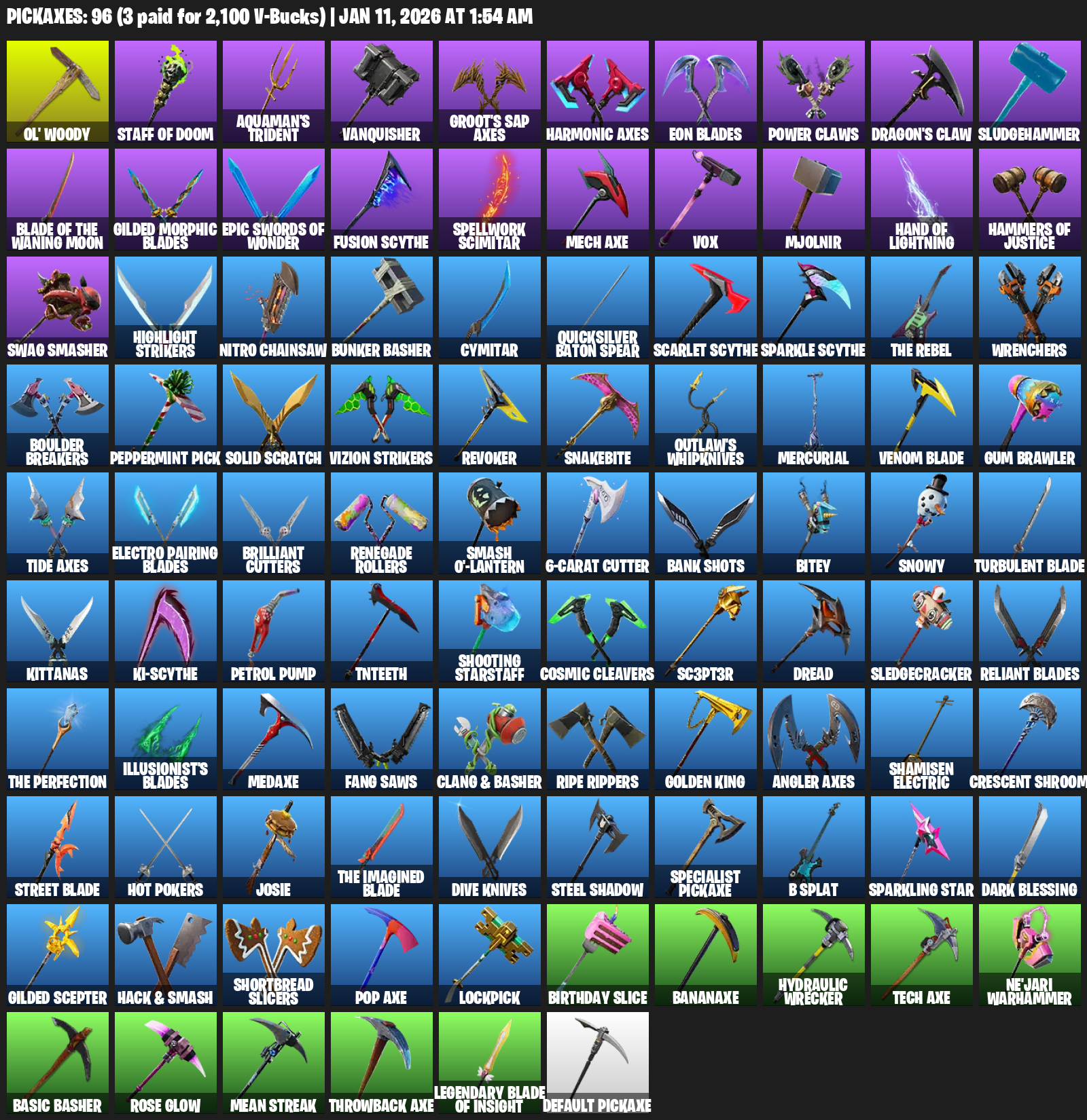 Ol’ Woody, Staff of Doom, Aquaman’s Trident, Vanquisher, Groot’s Sap Axes, Eon Blades, Power Claws, Dragon’s Claw, Sludgehammer, Spellwork Scimitar, Mech Axe, Vox, Mjolnir