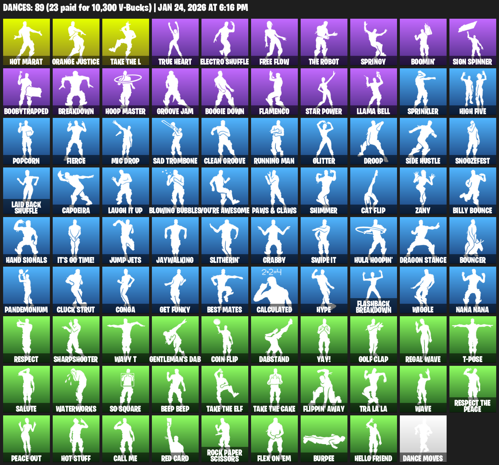 Hot Marat, Orange Justice, True Heart, Electro Shuffle, Free Flow, Springy, Boomin’, Sign Spinner, Boobytrapped, Breakdown, Hoop Master, Groove Jam, Boogie Down, Flamenco, Star Power, Llama Bell, Sprinkler, High Five