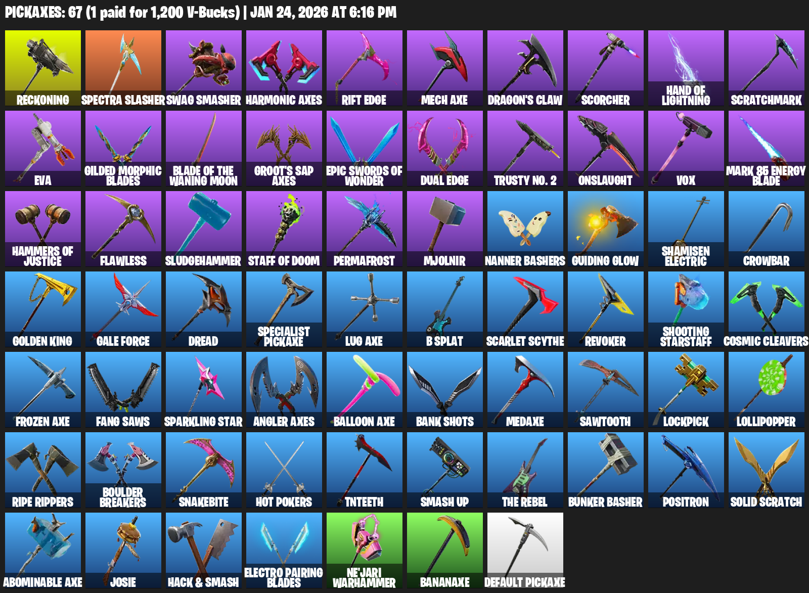 Reckoning, Spectra Slasher, Swag Smasher, Harmonic Axes, Rift Edge, Mech Axe, Dragon’s Claw, Scorcher, Hand of Lightning, Scratchmark, EVA, Gilded Morphic Blades, Trusty No. 2, Onslaught, Vox, Mark 85 Energy Blade