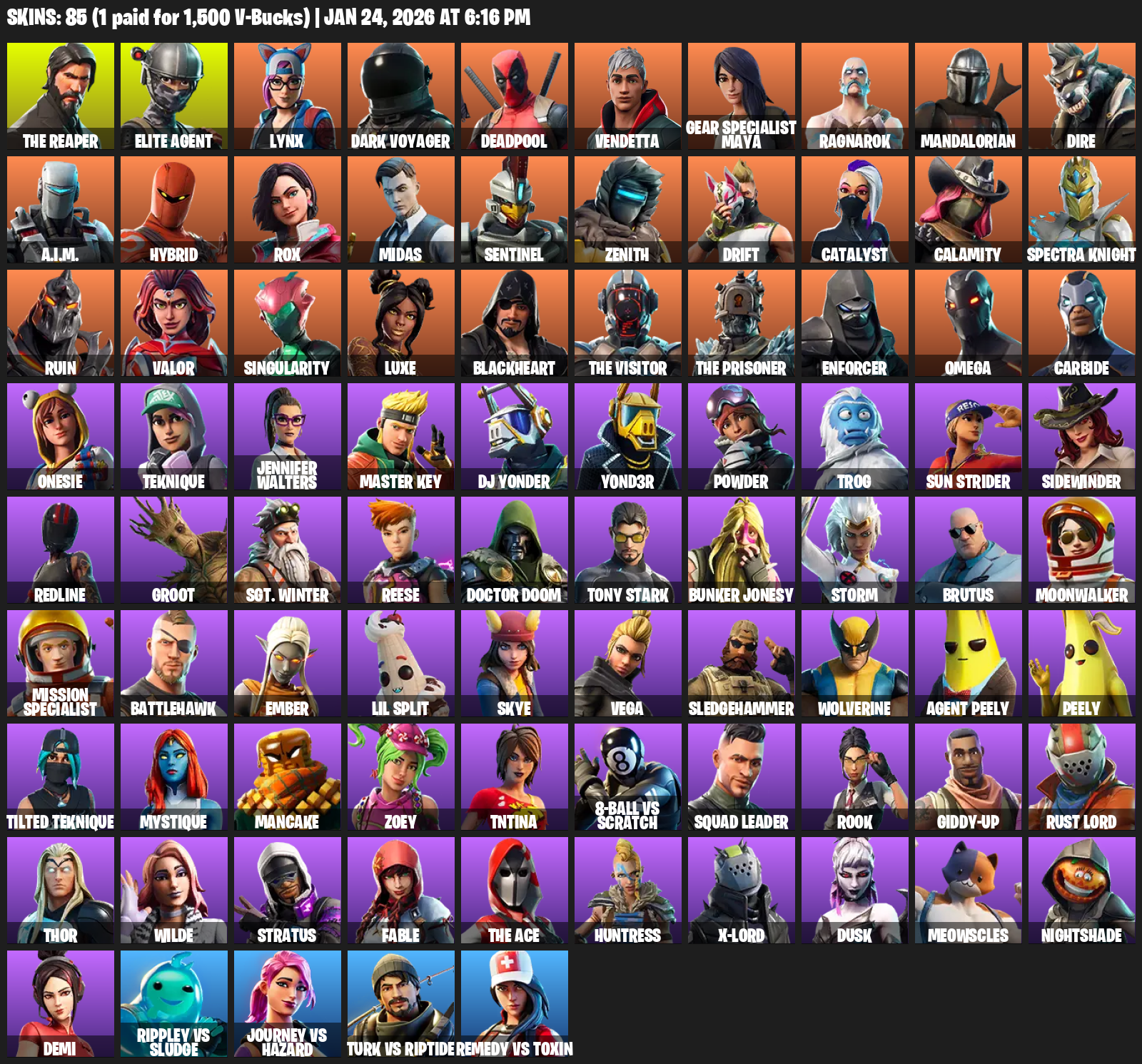 The Reaper, Elite Agent, Gear Specialist Maya, Omega, Lynx, Dark Voyager, Deadpool, Vendetta, Ragnarok, Mandalorian, Dire, A.I.M., Hybrid, Rox, Midas, Sentinel, Zenith, Drift, Catalyst, Calamity
