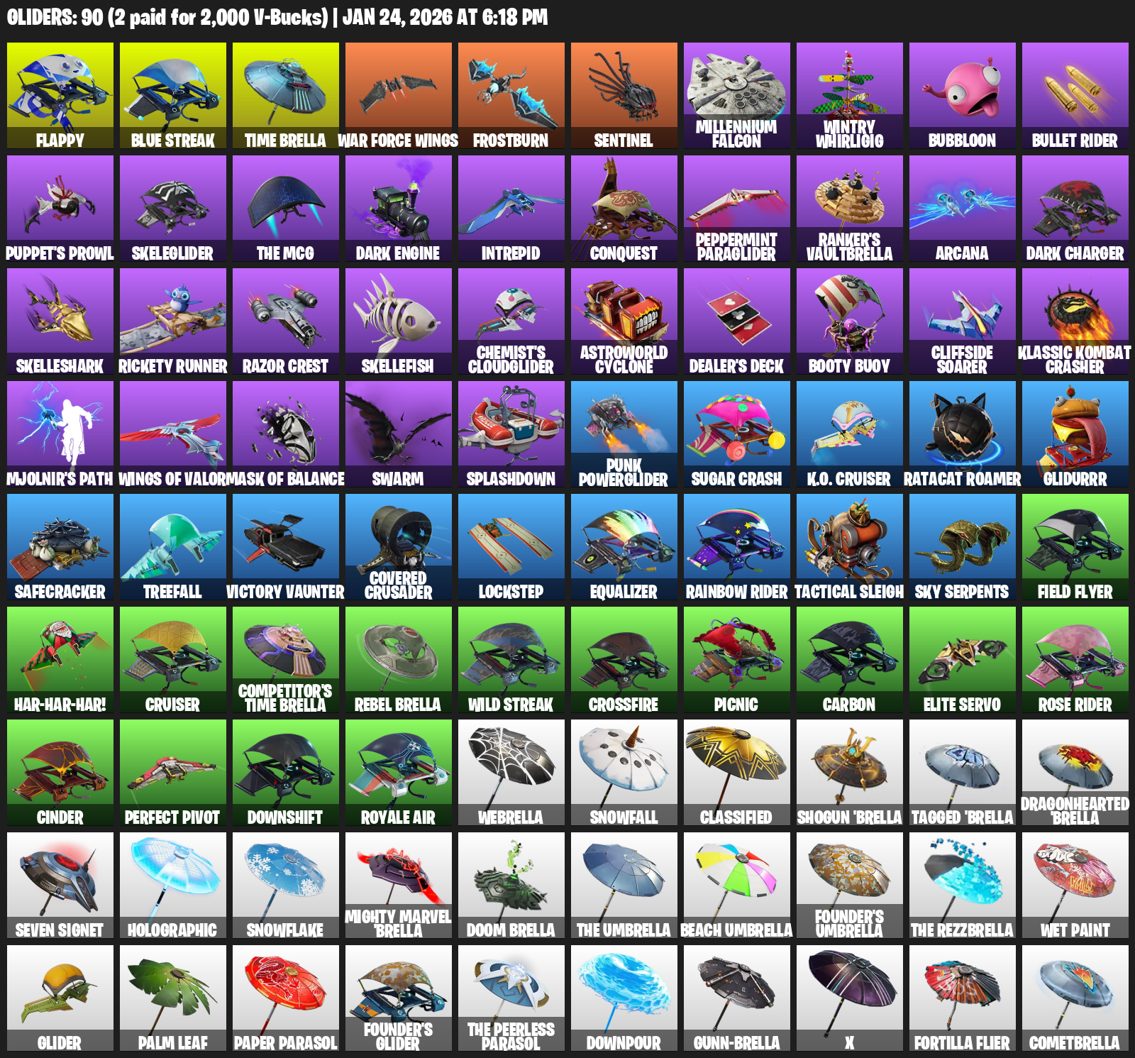 Flappy, Time Brella, War Force Wings, Frostburn, Sentinel, Millennium Falcon, Wintry Whirligig, Bubbloon, Bullet Rider, Puppet’s Prowl, Skeleglider, Dark Engine, Intrepid, Conquest, Peppermint Paraglider, Ranker’s Vaultbrella, Arcana