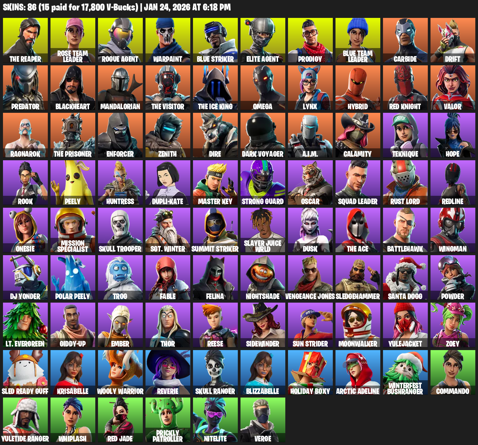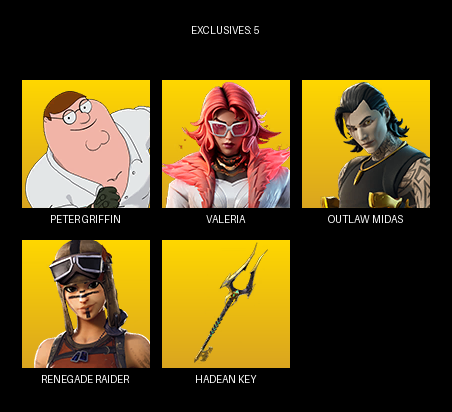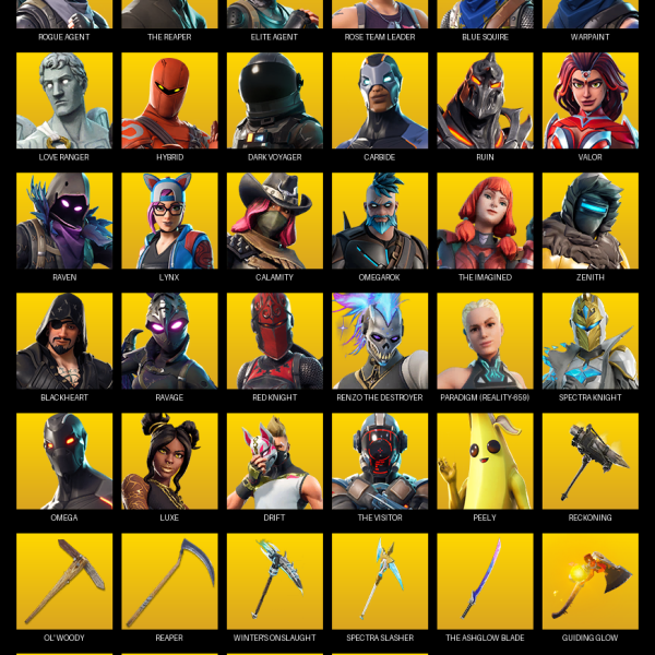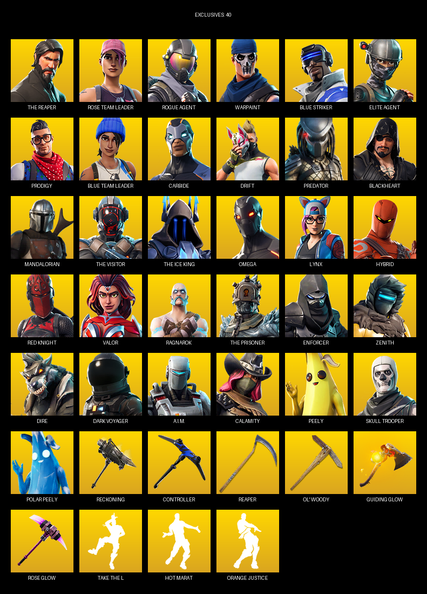 The Reaper, Elite Agent, Omega, Rose Team Leader, Warpaint, Blue Striker, Prodigy, Carbide, Drift, Predator, Blackheart, Mandalorian, Lynx, Hybrid, Red Knight, Valor