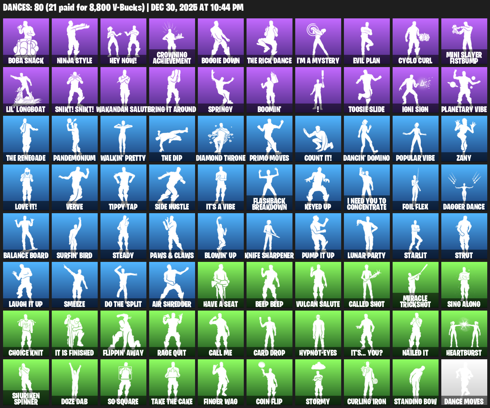 Boba Snack, Ninja Style, Hey Now!, Crowning Achievement, Boogie Down, I’m a Mystery, Evil Plan, Cyclo Curl, Mini Slayer Fistbump, Lil’ Longboat, Snikt! Snikt!, Wakandan Salute, Bring it around, Springy, Boomin’, !, Toosie Slide, Igni Sign, Planetary Vibe