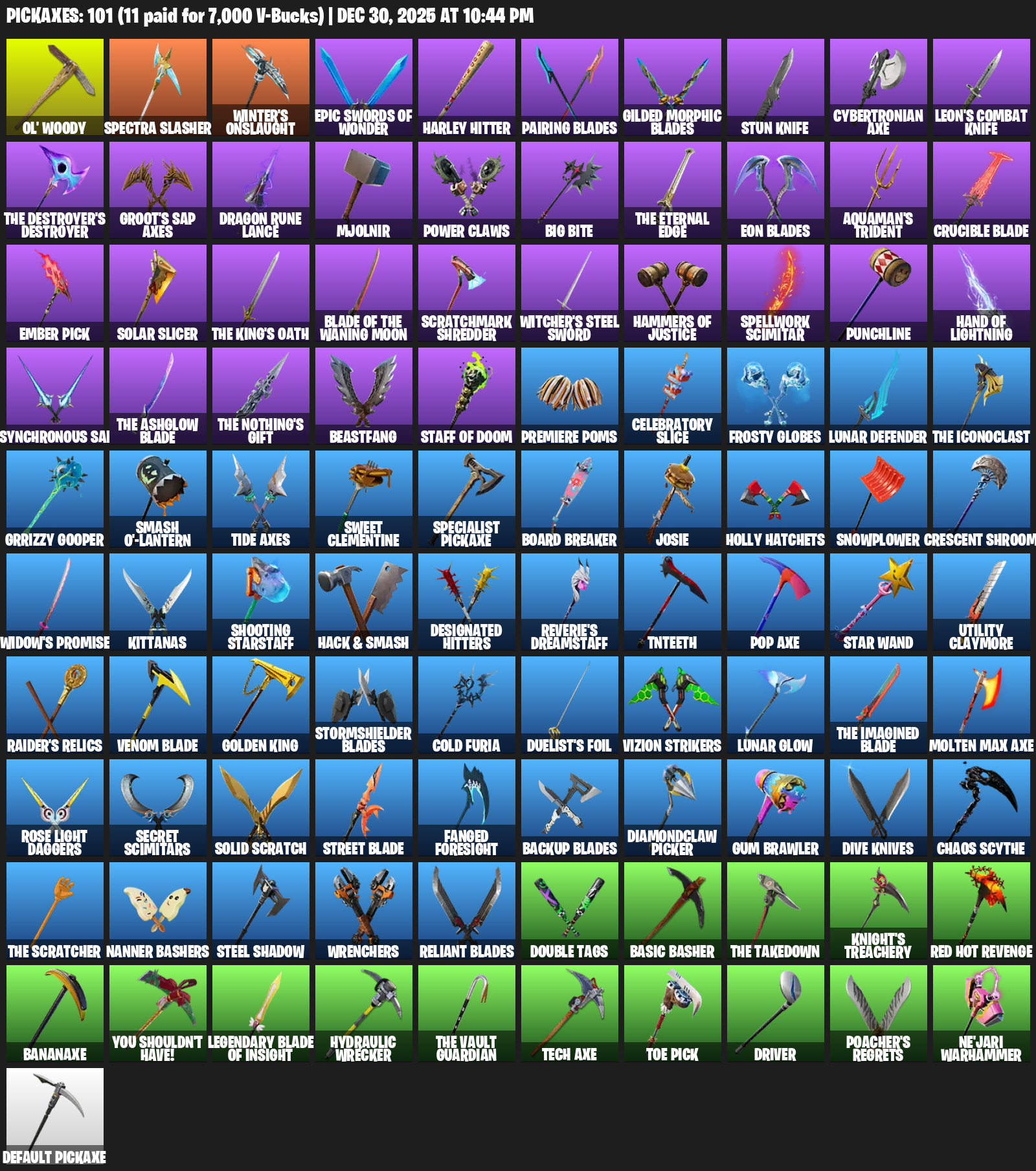 Ol’ Woody, Winter’s Onslaught, Harley Hitter, Pairing Blades, Stun Knife, Cybertronian Axe, Groot’s Sap Axes, Dragon Rune Lance, Mjolnir, Power Claws, Big Bite, Aquaman’s Trident, Crucible Blade