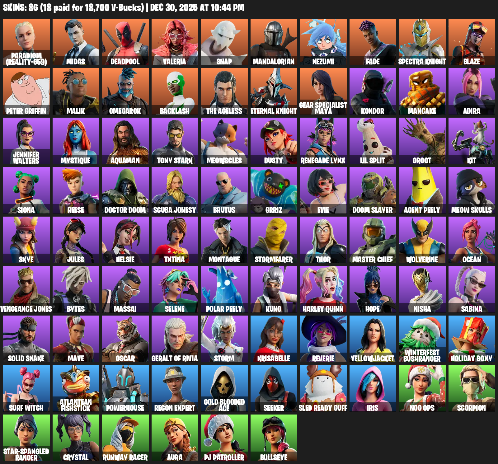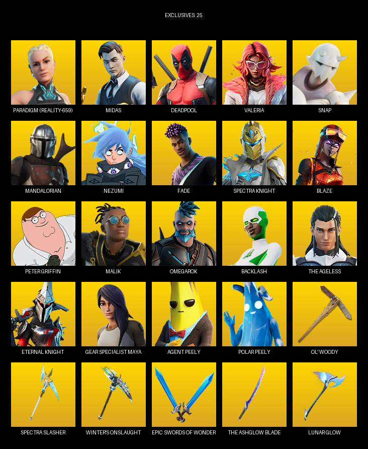 Gear Specialist Maya, Paradigm (Reality-659), Midas, Deadpool, Valeria, Snap, Mandalorian, Nezumi, Fade, Spectra Knight, Blaze, Peter Griffin, Malik, Omegarok, Backlash, The Ageless, Kondor, Mancake, Adira