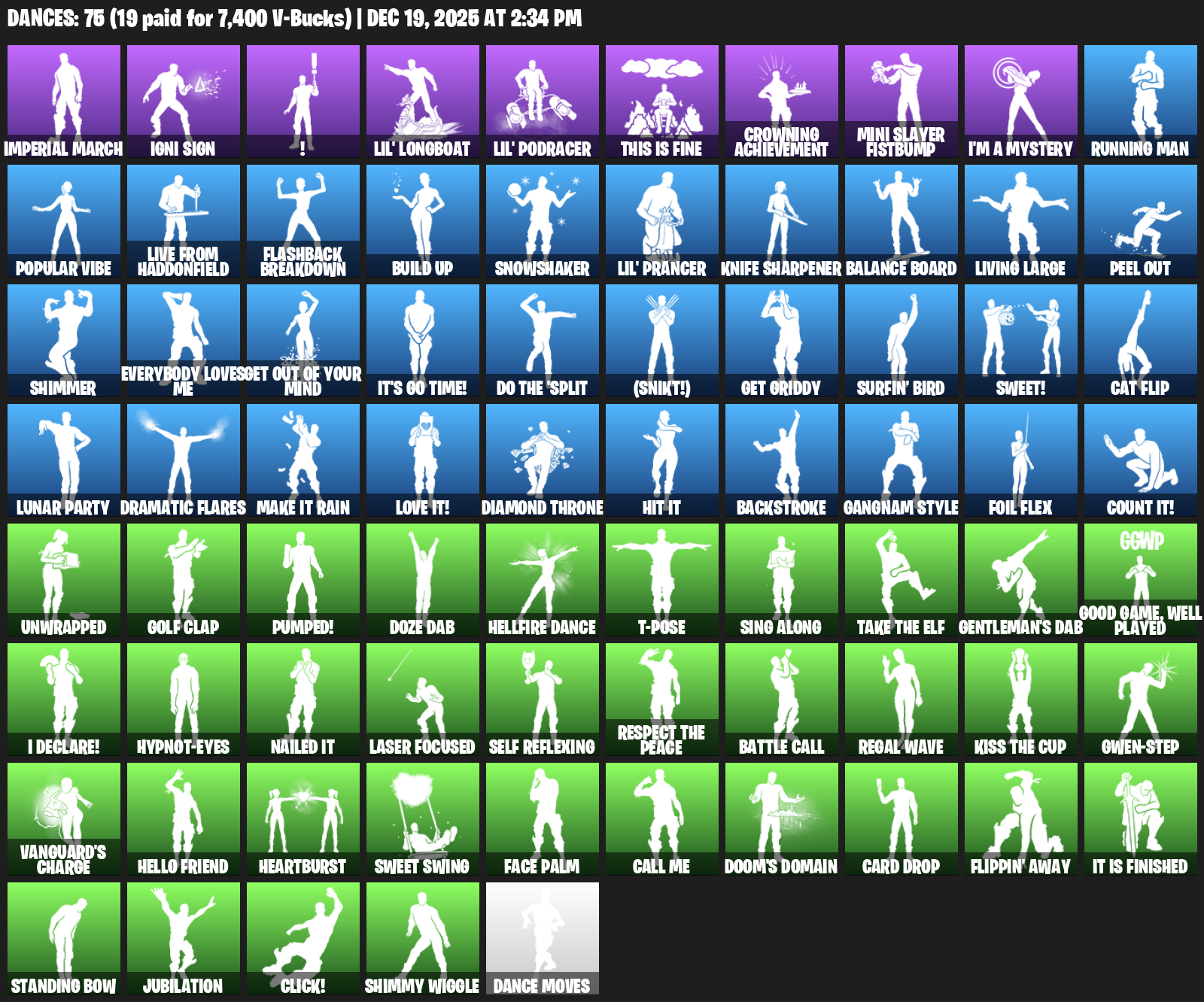 Imperial March, Igni Sign, !, Lil’ Longboat, This is Fine, Crowning Achievement, Mini Slayer Fistbump, I’m a Mystery, Running Man, Popular Vibe, Live From Haddonfield, Flashback Breakdown, Snowshaker, Balance Board, Living Large, Peel Out