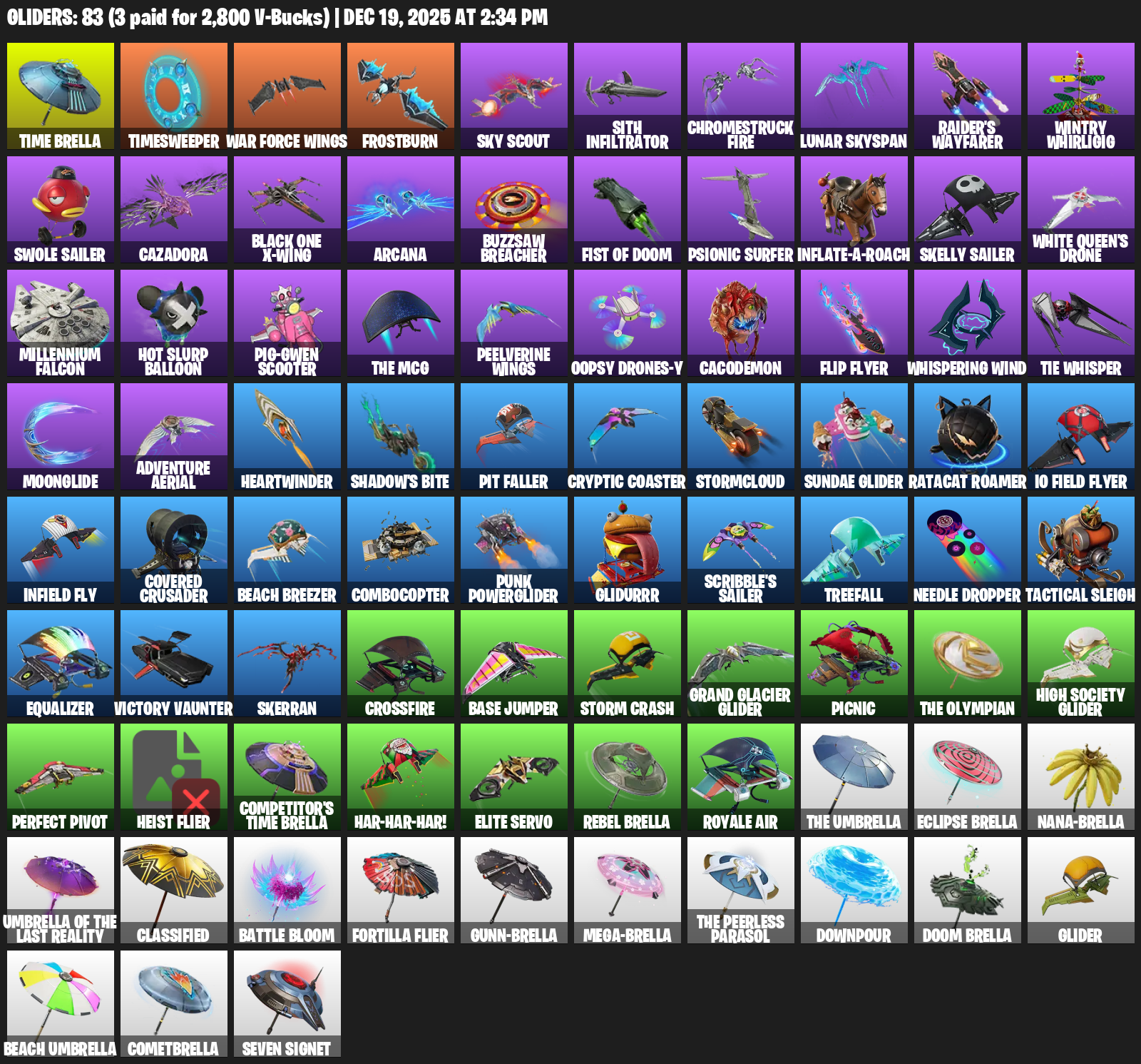 Time Brella, Timesweeper, War Force Wings, Frostburn, Sky Scout, Sith Infiltrator, Chromestruck Fire, Lunar Skyspan, Raider’s Wayfarer, Wintry Whirligig, Swole Sailer, Cazadora, Black One X-wing, Arcana, Buzzsaw Breacher, Fist of Doom, Psionic Surfer, White Queen’s Drone