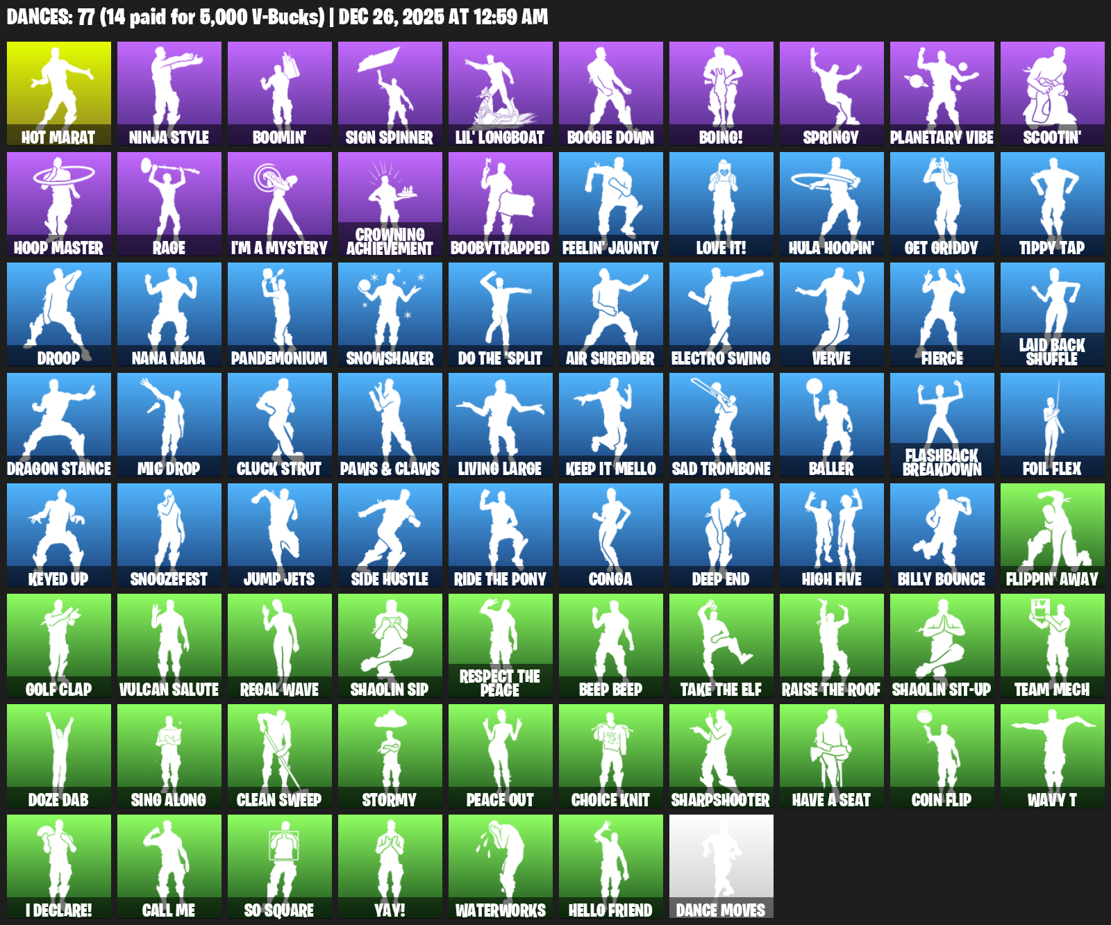 Hot Marat, Ninja Style, Boomin’, Sign Spinner, Lil’ Longboat, Boogie Down, Boing!, Springy, Planetary Vibe, Scootin’, Hoop Master, Rage, I’m a Mystery, Crowning Achievement, Boobytrapped, Feelin’ Jaunty, Love it!, Hula Hoopin’, Get Griddy, Tippy Tap