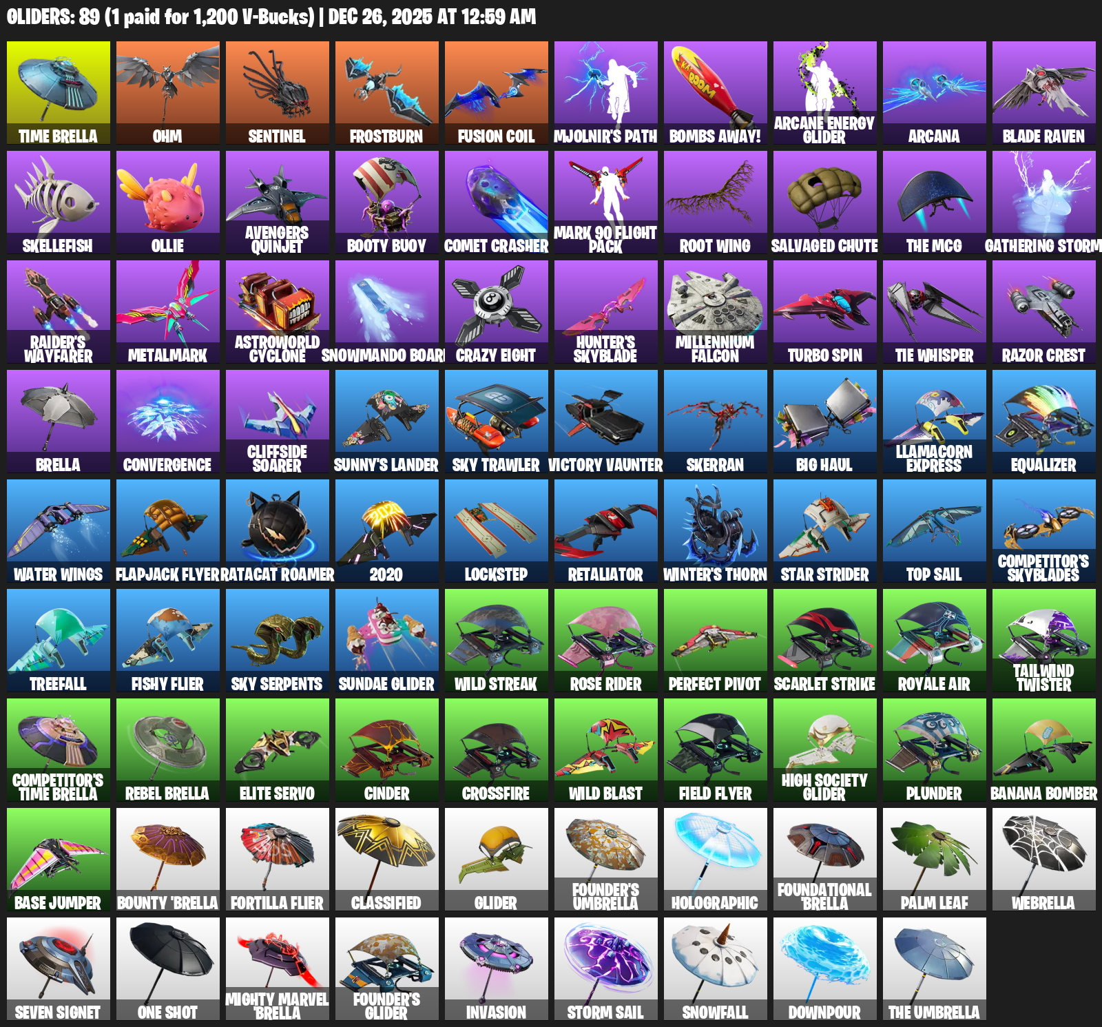 Time Brella, Ohm, Frostburn, Mjolnir’s Path, Bombs Away!, Arcana, Skellefish, Ollie, Avengers Quinjet, Booty Buoy, Comet Crasher, Root Wing, Salvaged Chute, The MCG, Gathering Storm