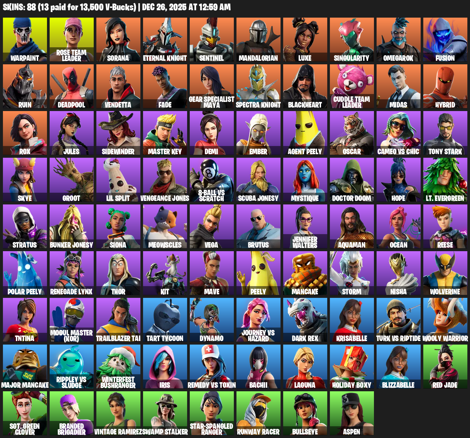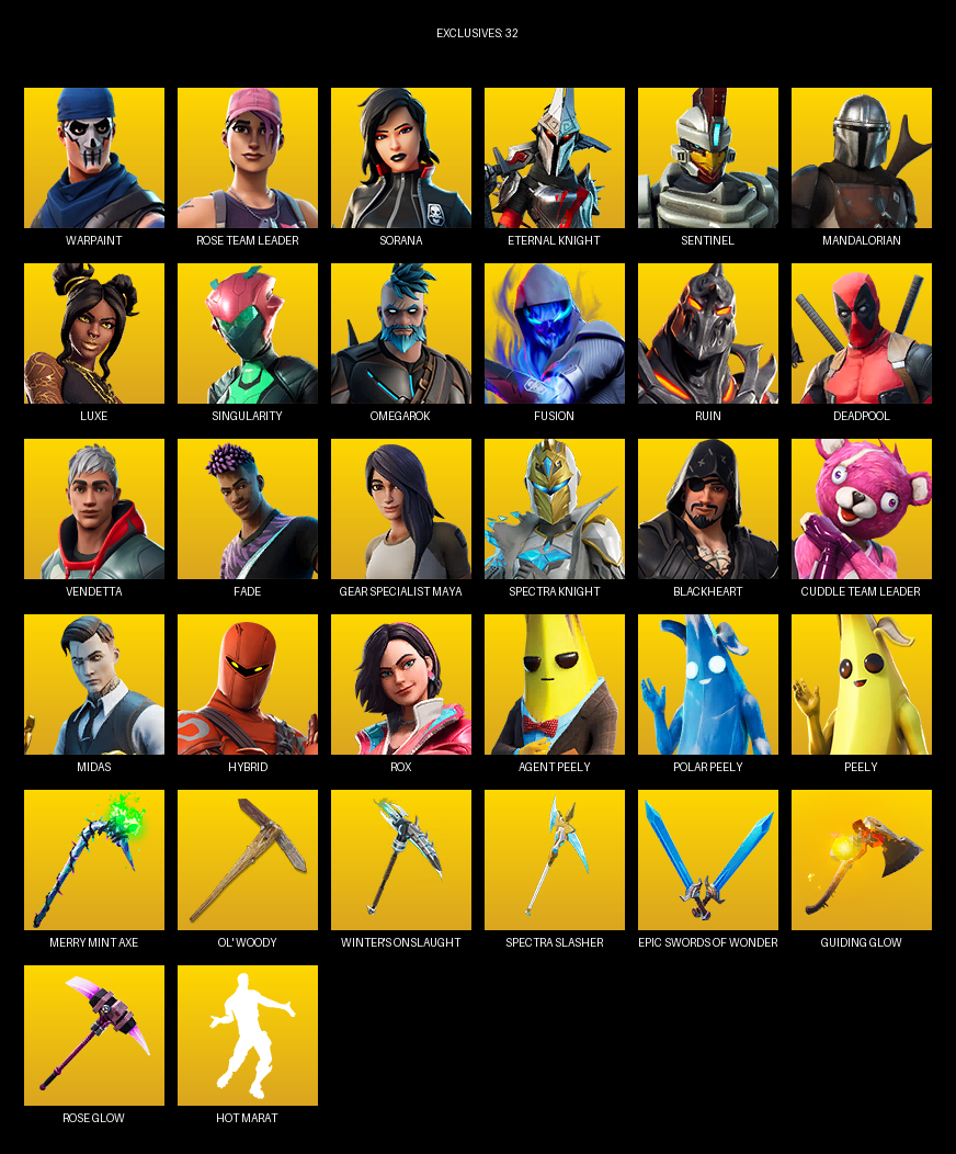 Gear Specialist Maya, Warpaint, Rose Team Leader, Sorana, Eternal Knight, Sentinel, Mandalorian, Luxe, Singularity, Omegarok, Fusion, Ruin, Deadpool, Vendetta, Fade, Blackheart, Midas, Hybrid
