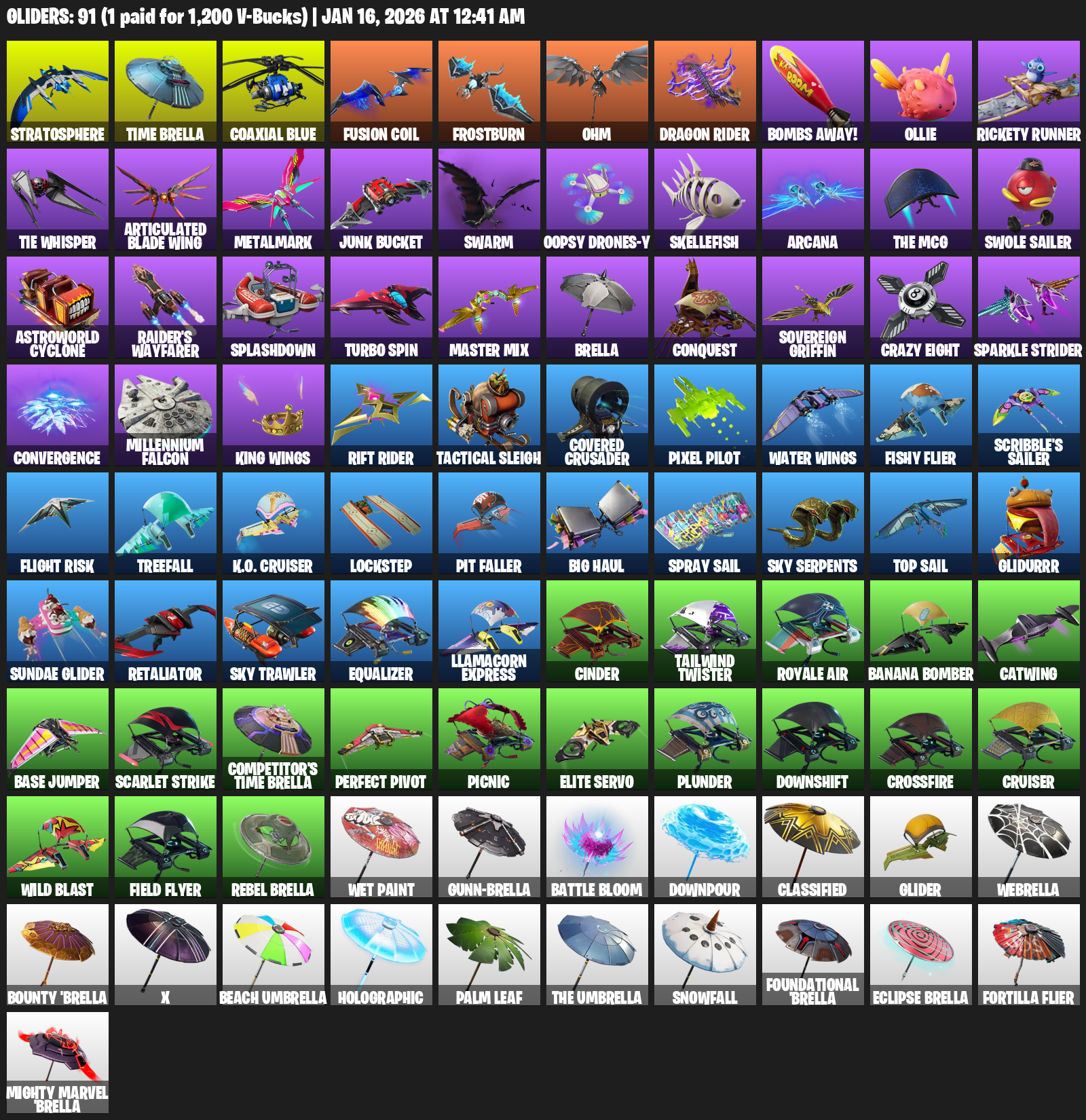 Stratosphere, Time Brella, Coaxial Blue, Fusion Coil, Frostburn, Ohm, Bombs Away!, Ollie, Rickety Runner, TIE Whisper, Articulated Blade Wing, Metalmark, Junk Bucket, Swarm, Oopsy Drones-y, Skellefish, Arcana, Swole Sailer