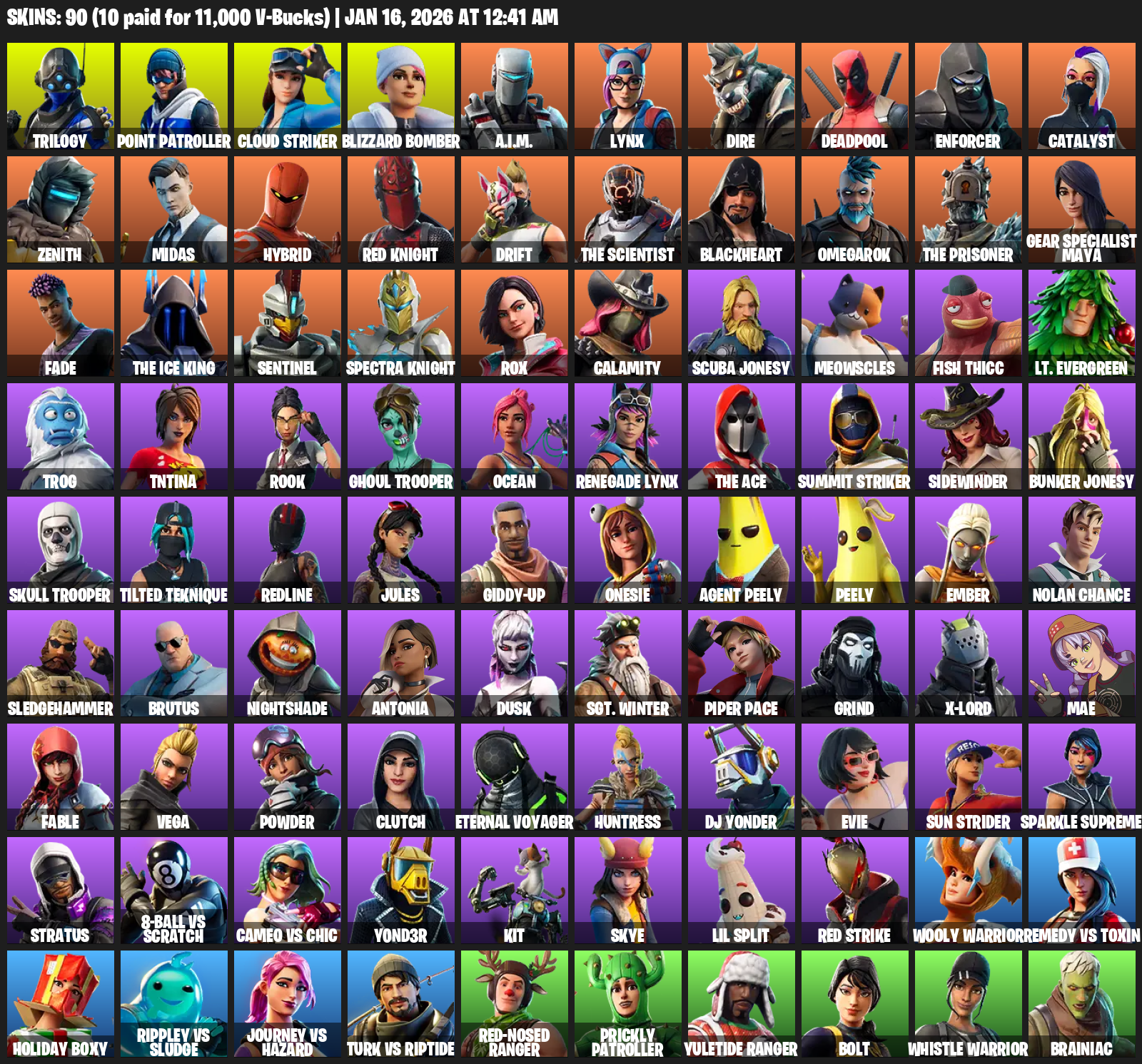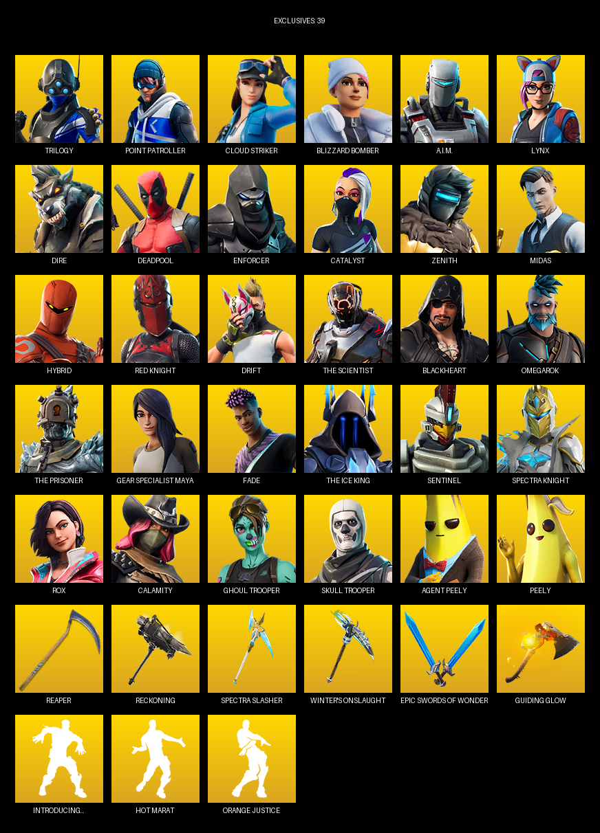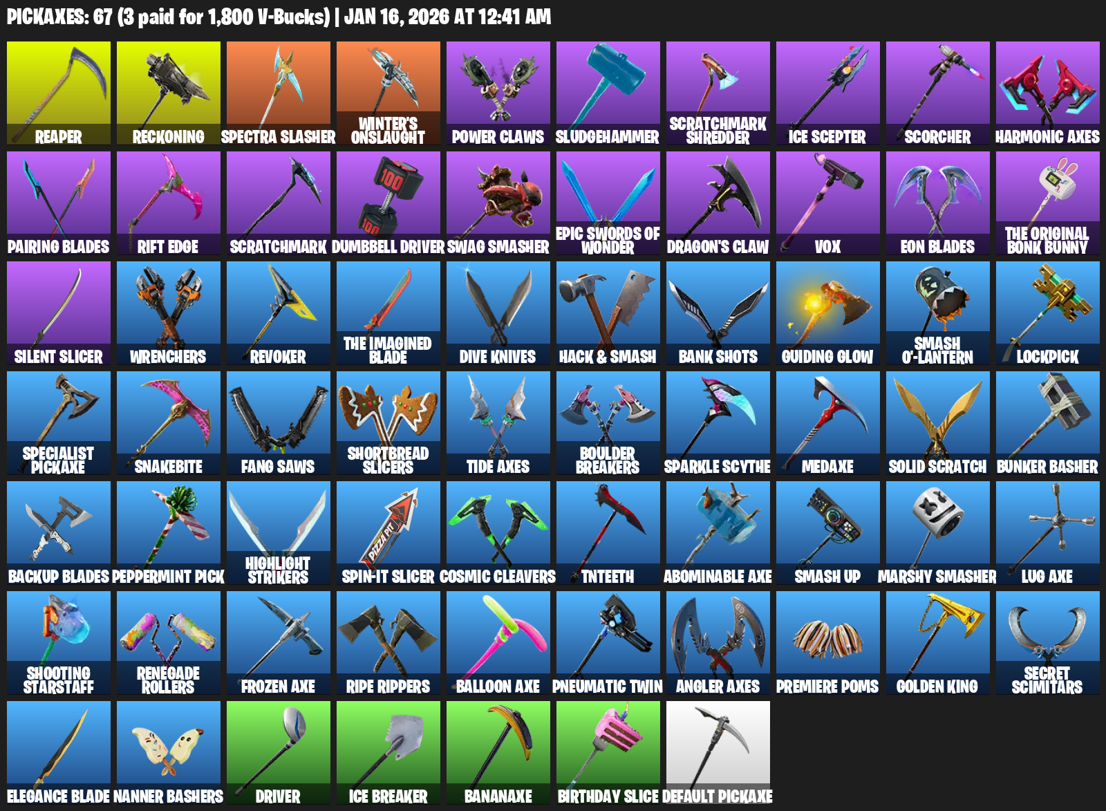 Reaper, Reckoning, Spectra Slasher, Winter’s Onslaught, Power Claws, Sludgehammer, Scratchmark Shredder, Ice Scepter, Scorcher, Harmonic Axes, Pairing Blades, Rift Edge, Dumbbell Driver, Swag Smasher, Dragon’s Claw, Vox