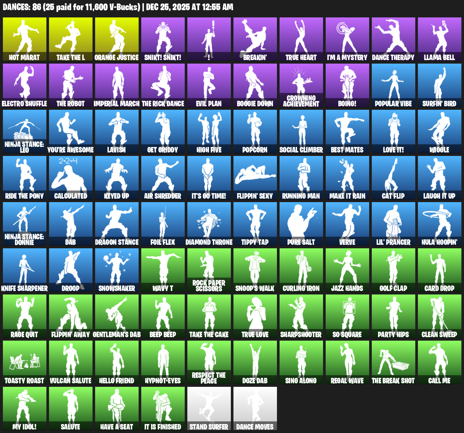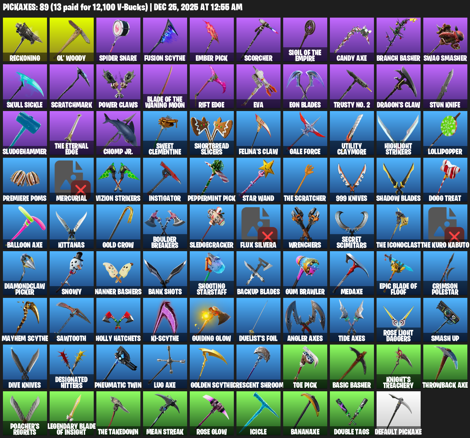 Reckoning, Ol’ Woody, Spider Snare, Fusion Scythe, Ember Pick, Scorcher, Candy Axe, Branch Basher, Swag Smasher, Skull Sickle, Scratchmark, Power Claws, Rift Edge, EVA, Eon Blades, Trusty No. 2, Dragon’s Claw, Stun Knife