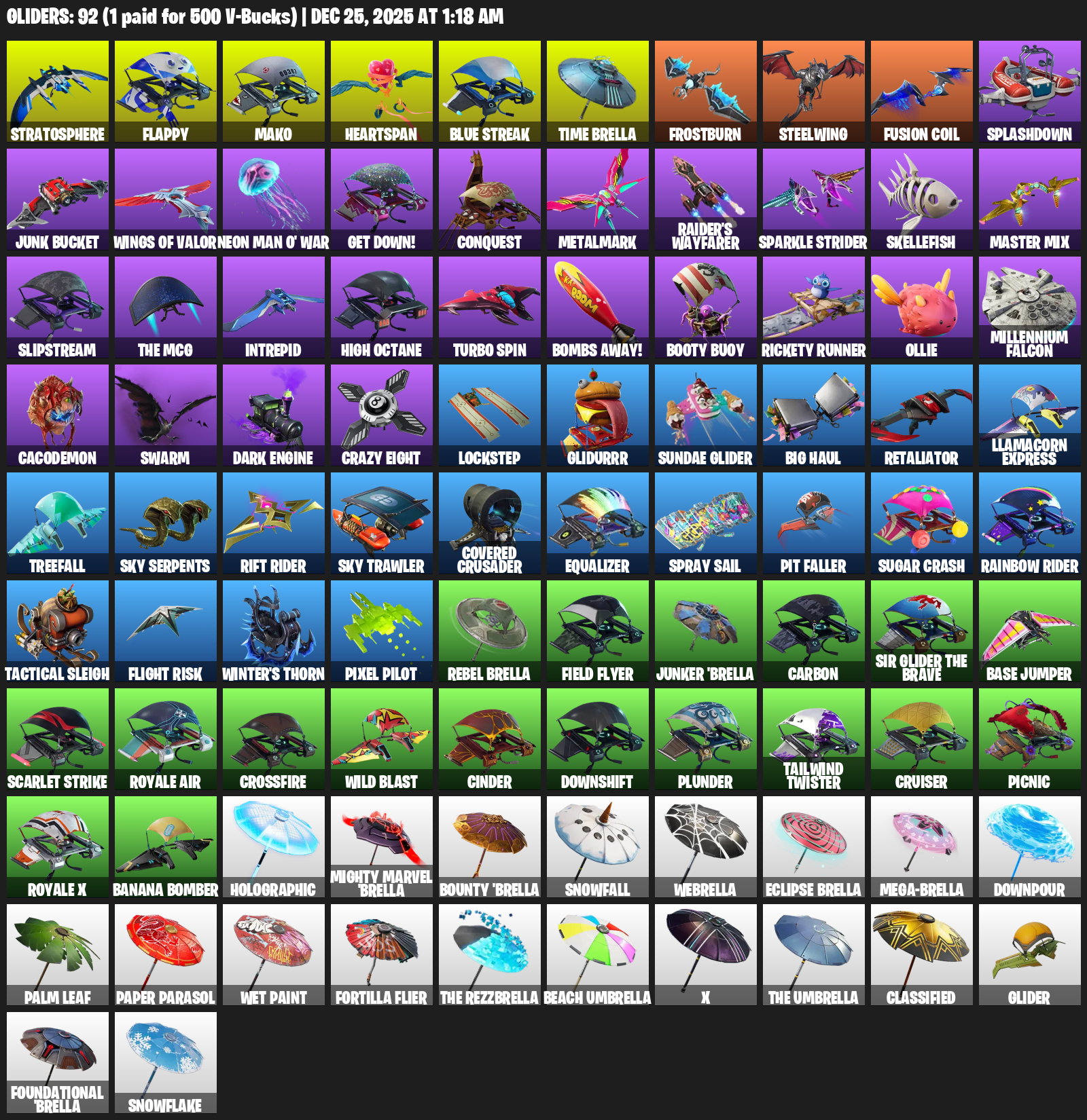 Mako, Stratosphere, Flappy, Heartspan, Time Brella, Frostburn, Steelwing, Splashdown, Junk Bucket, Neon Man O’ War, Get Down!, Conquest, Metalmark, Raider’s Wayfarer, Sparkle Strider, Skellefish, Master Mix