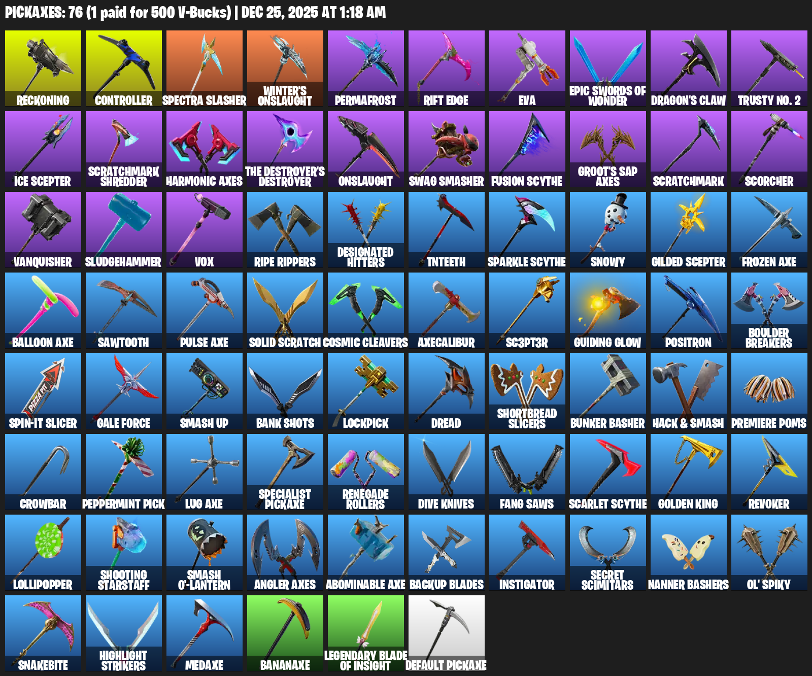 Reckoning, Controller, Spectra Slasher, Winter’s Onslaught, Permafrost, Rift Edge, EVA, Dragon’s Claw, Trusty No. 2, Ice Scepter, Scratchmark Shredder, Harmonic Axes, Swag Smasher, Fusion Scythe, Scorcher