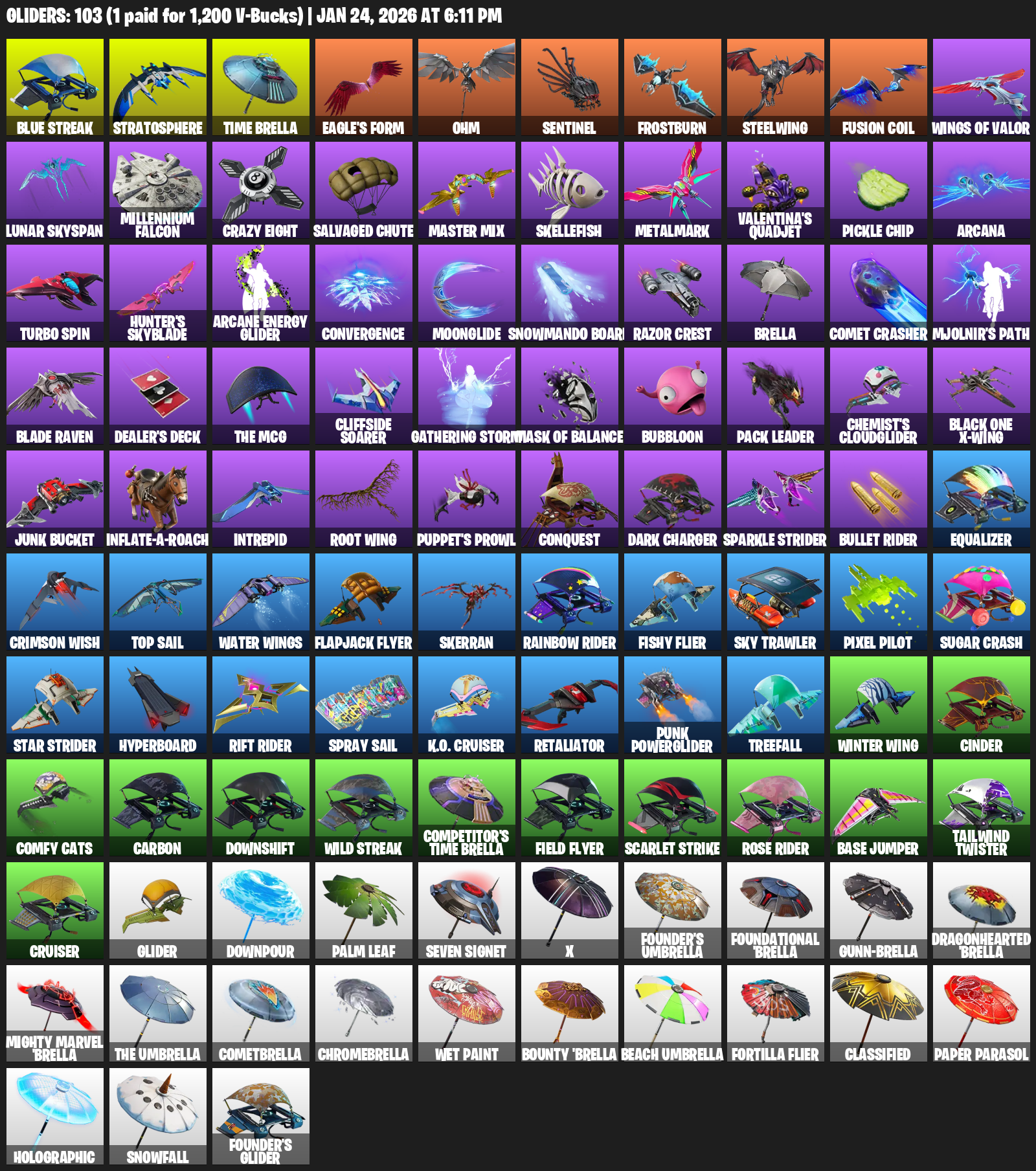 Stratosphere, Time Brella, Eagle’s Form, Ohm, Frostburn, Steelwing, Lunar Skyspan, Millennium Falcon, Crazy Eight, Salvaged Chute, Master Mix, Skellefish, Metalmark, Valentina’s Quadjet, Pickle Chip, Arcana