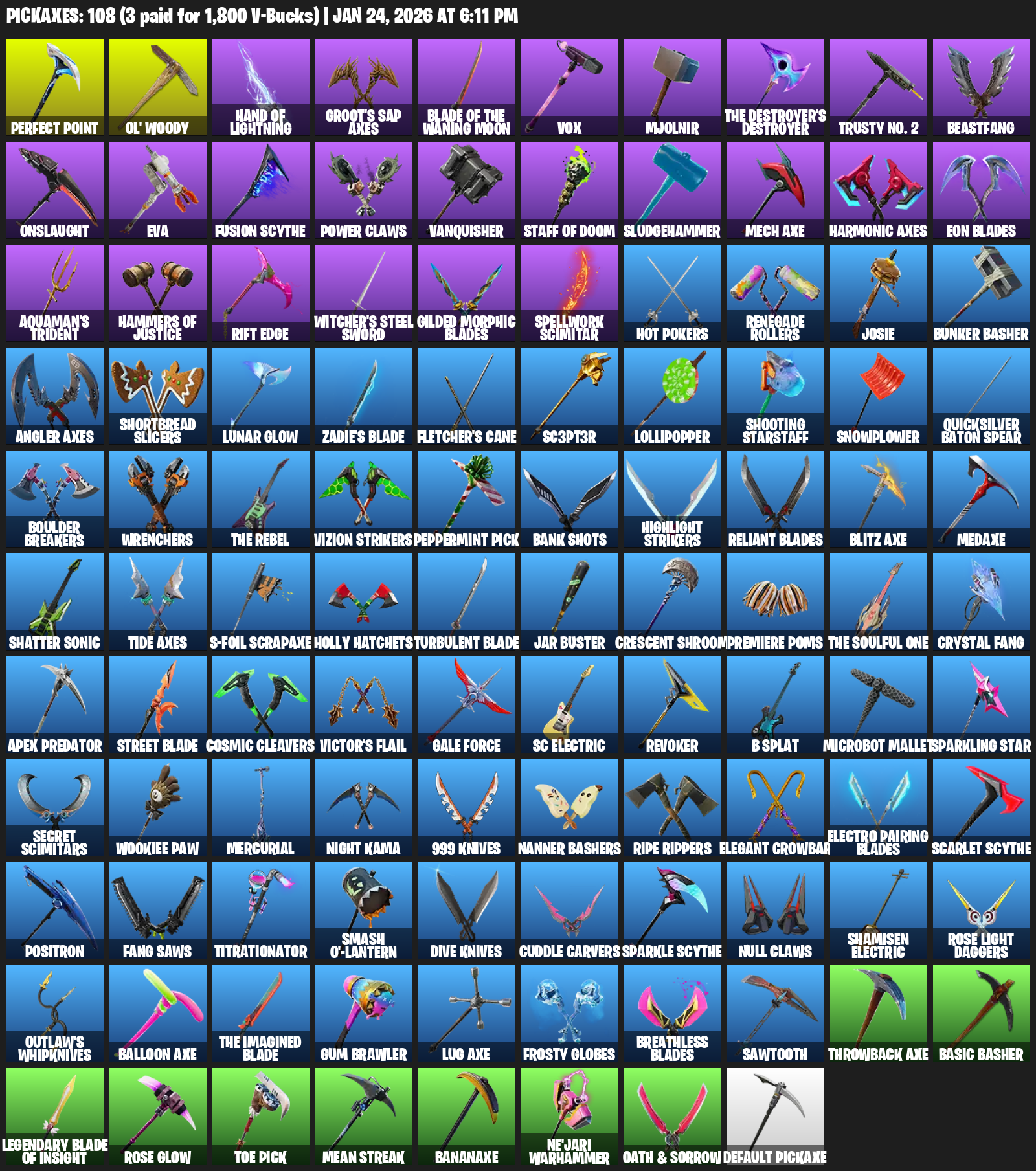 Ol’ Woody, Hand of Lightning, Groot’s Sap Axes, Vox, Mjolnir, Trusty No. 2, Beastfang, Onslaught, EVA, Fusion Scythe, Power Claws, Vanquisher, Sludgehammer, Mech Axe, Eon Blades