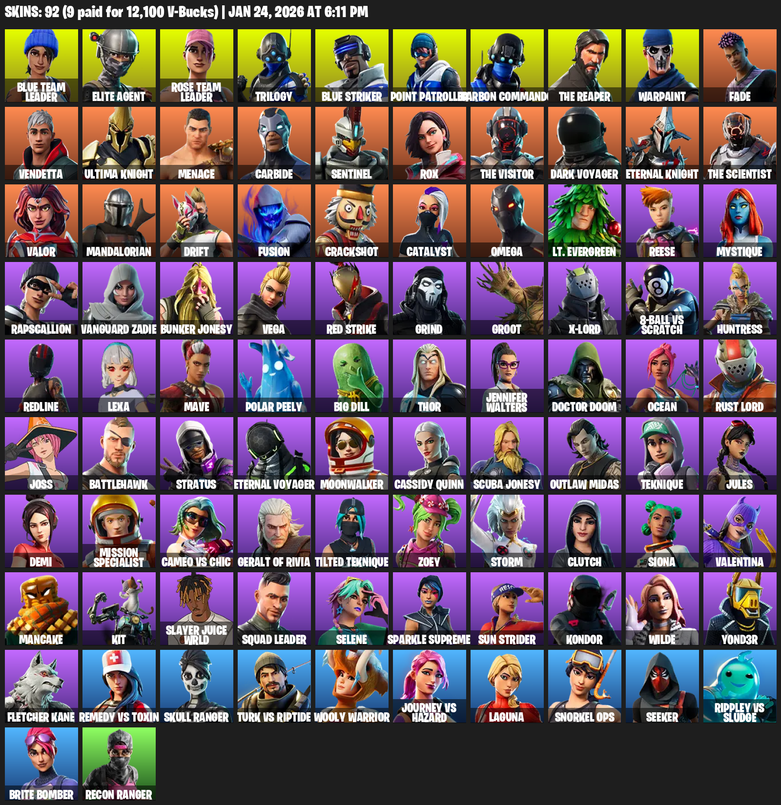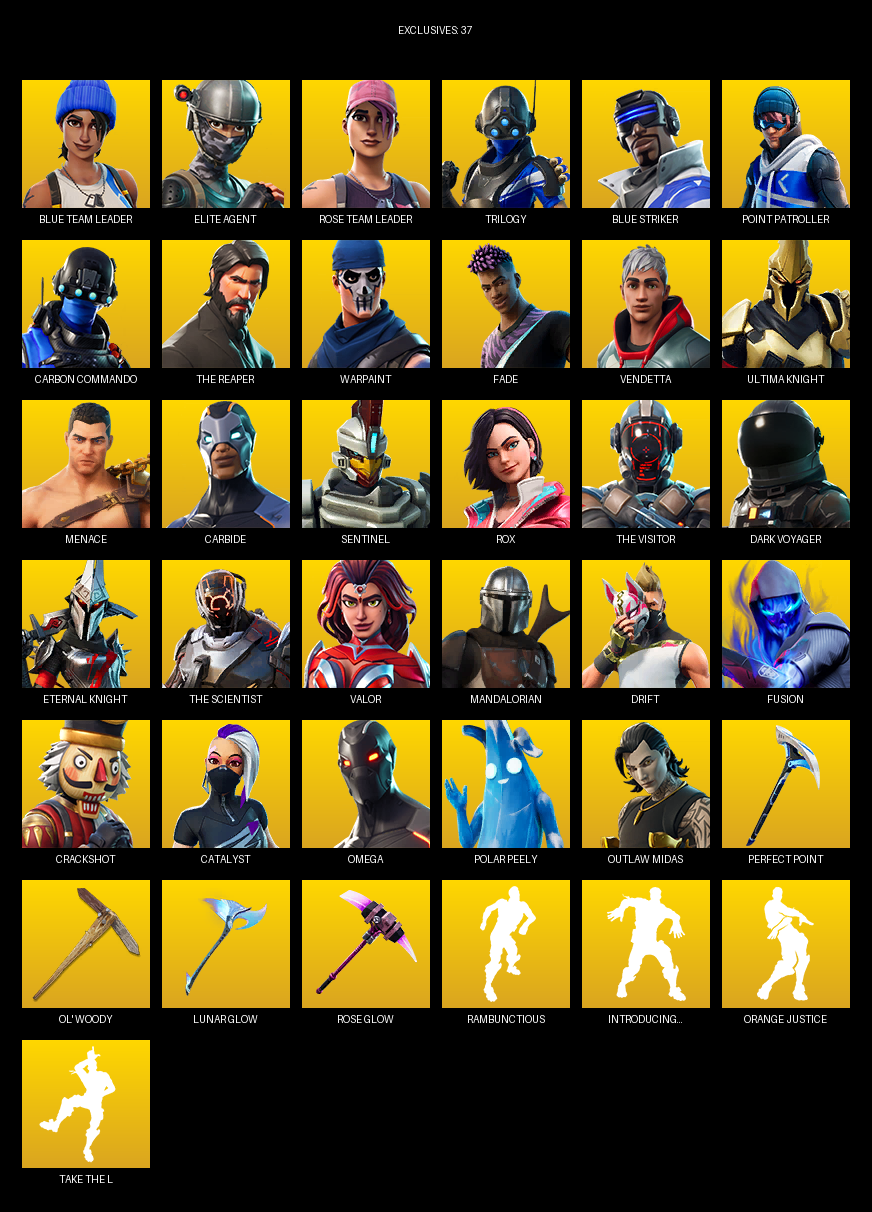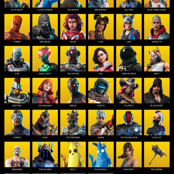 Elite Agent, Point Patroller, The Reaper, Omega, Blue Team Leader, Trilogy, Carbon Commando, Warpaint, Fade, Vendetta, Ultima Knight, Menace, Carbide, Sentinel, Rox, Dark Voyager