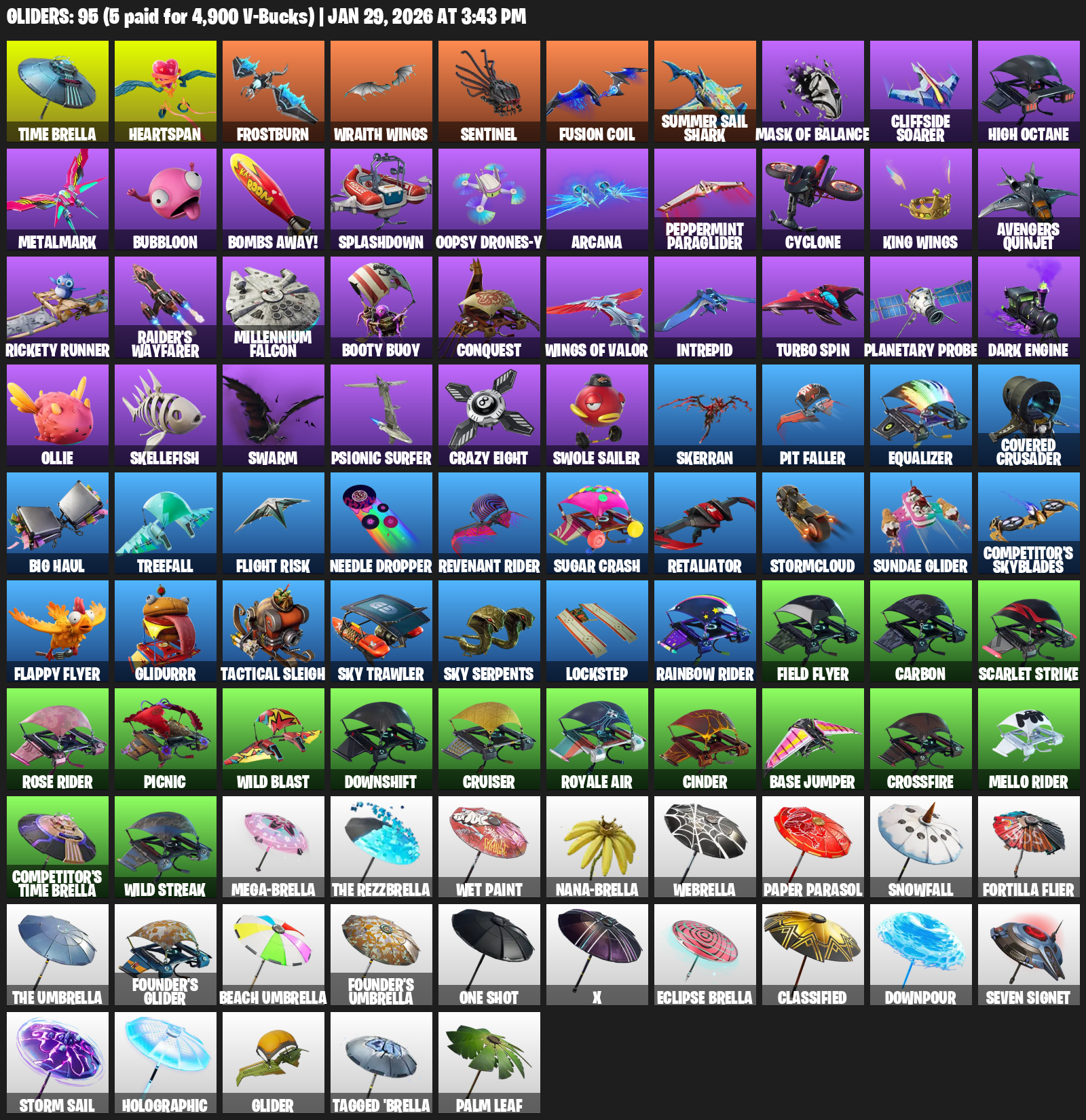 Time Brella, Heartspan, Frostburn, Wraith Wings, Sentinel, Fusion Coil, Summer Sail Shark, Mask of Balance, Cliffside Soarer, High Octane, Metalmark, Bubbloon, Bombs Away!, Splashdown, Oopsy Drones-y, Arcana, Peppermint Paraglider, Cyclone, Avengers Quinjet