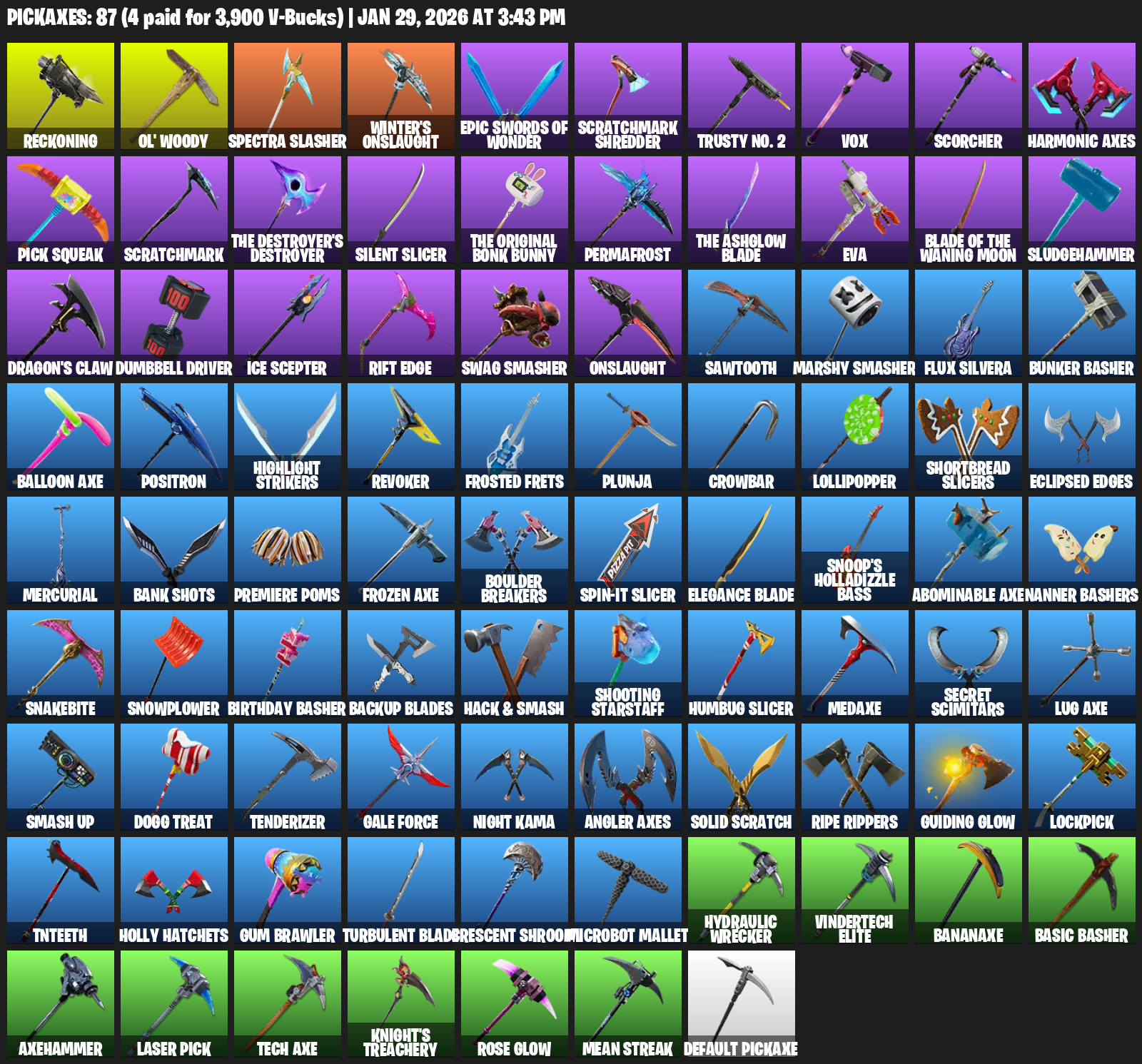 Reckoning, Ol’ Woody, Winter’s Onslaught, Scratchmark Shredder, Trusty No. 2, Vox, Scorcher, Harmonic Axes, Pick Squeak, Silent Slicer, Permafrost, EVA, Sludgehammer