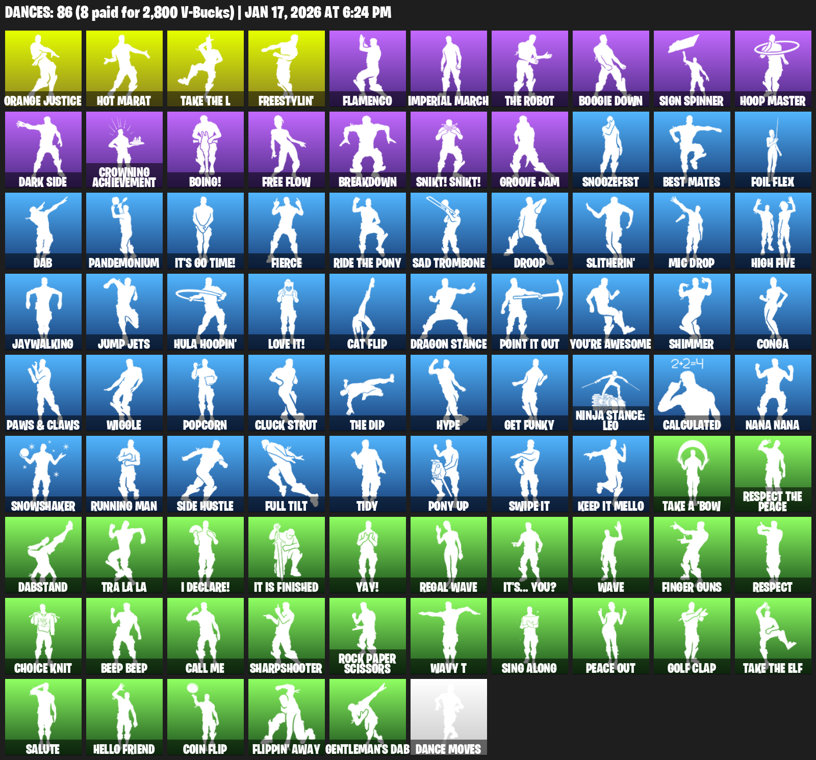Hot Marat, Orange Justice, Freestylin’, Flamenco, Imperial March, Boogie Down, Sign Spinner, Hoop Master, Crowning Achievement, Boing!, Free Flow, Breakdown, Snikt! Snikt!, Groove Jam, Snoozefest, Best Mates, Foil Flex